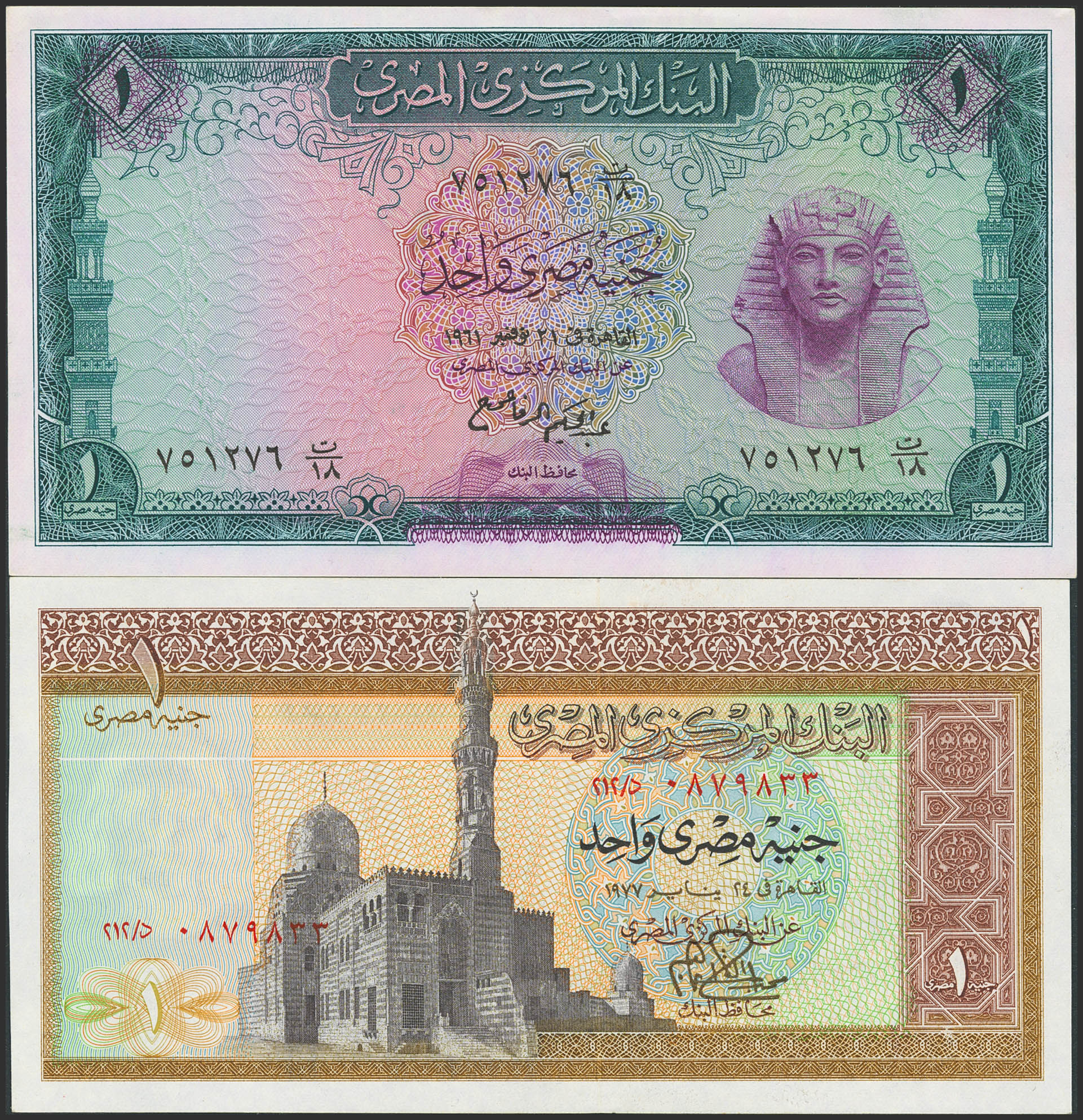 EGYPT. Lot of 2 notes of 1 Pound. 1961 and 1977. Central Bank. (Pick: 37a, 44c). Almost Uncirculated (p37) and Uncirculated.