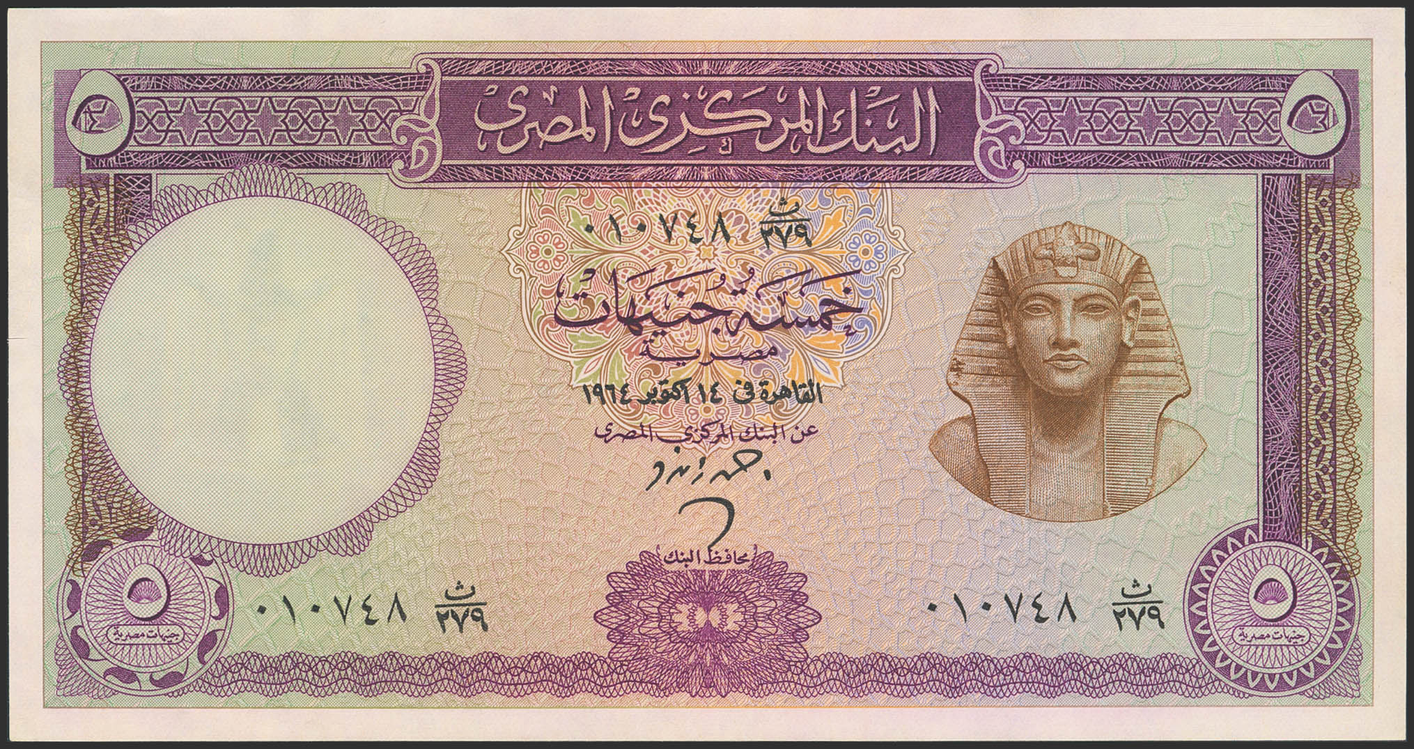 EGYPT. 5 Pounds. 1964. Central Bank. (Pick: 40). Almost Uncirculated.