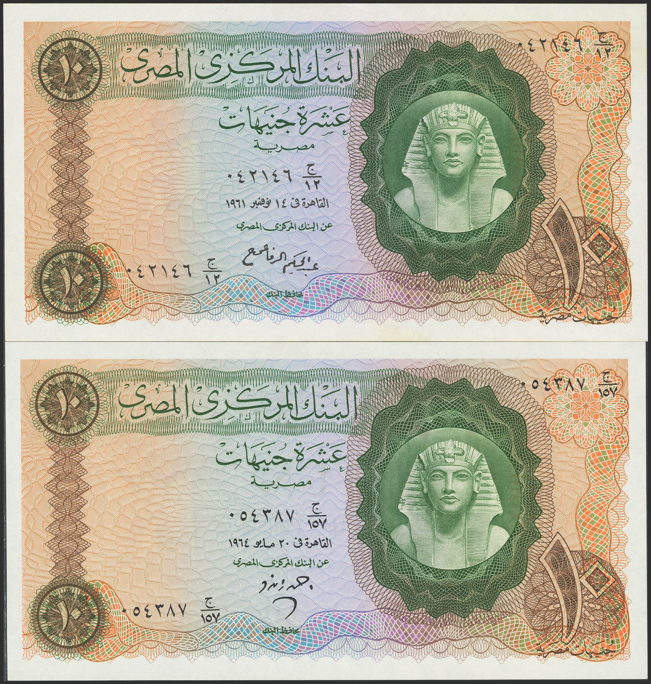 EGYPT. Lot of 2 notes of 10 Egyptian Pounds. 1961 and 1964. Central Bank. All known signatures. (Pick: 41). Uncirculated and More than Extremely Fine.
