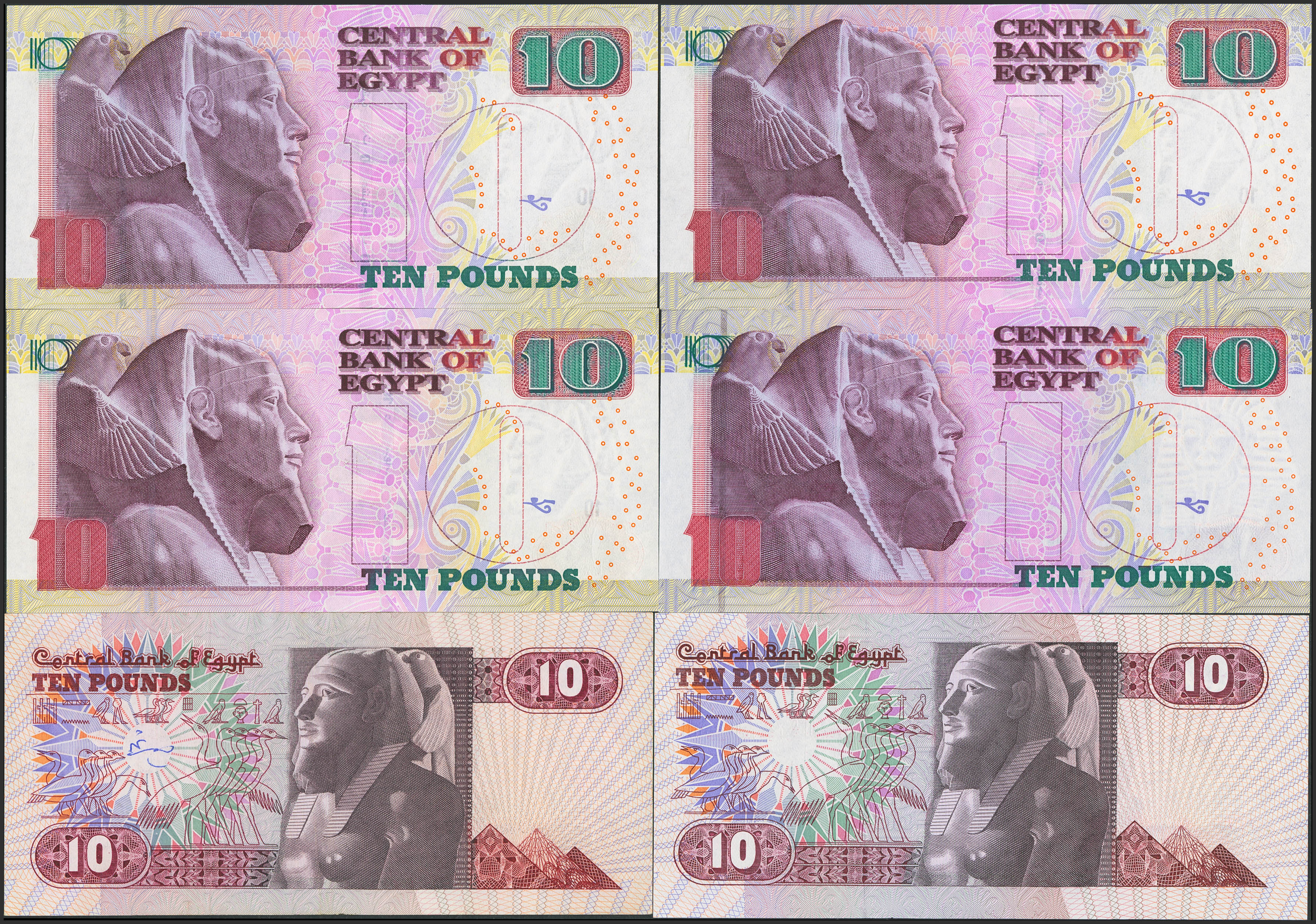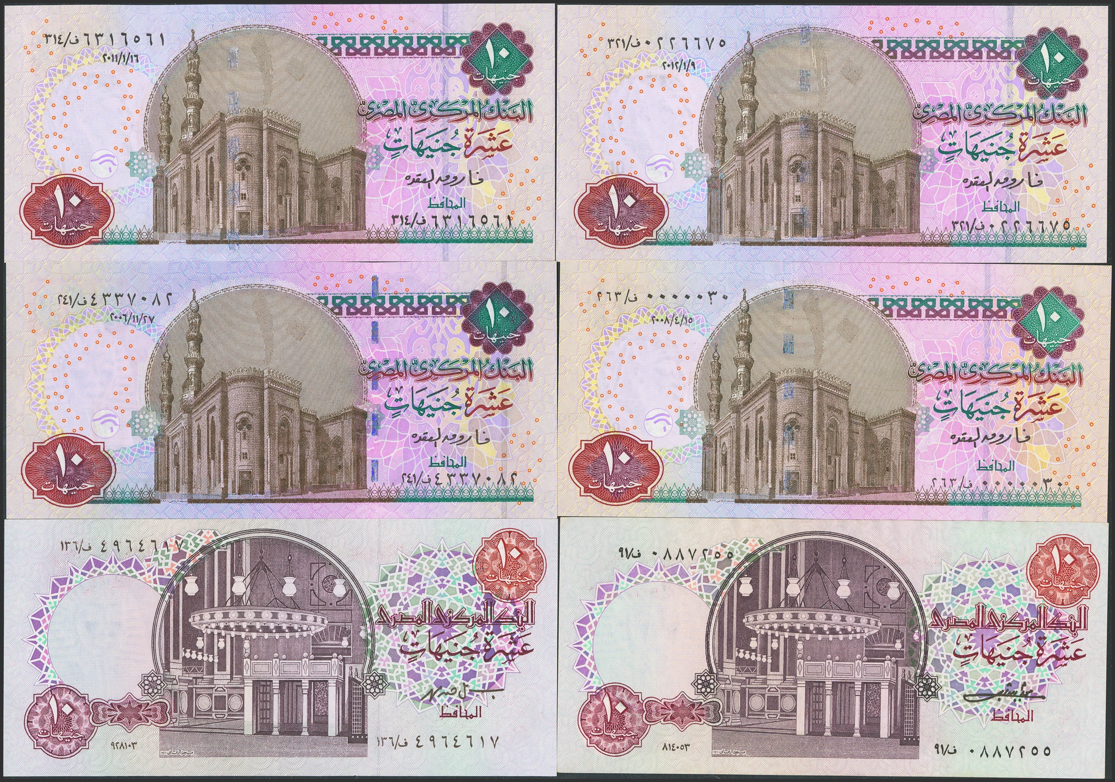 EGYPT. Lot of 6 notes of 10 Pounds. 1983 to 2012. Central Bank. A low serial number included. (Pick: 51b, 51e, 64c(4)). Uncirculated.