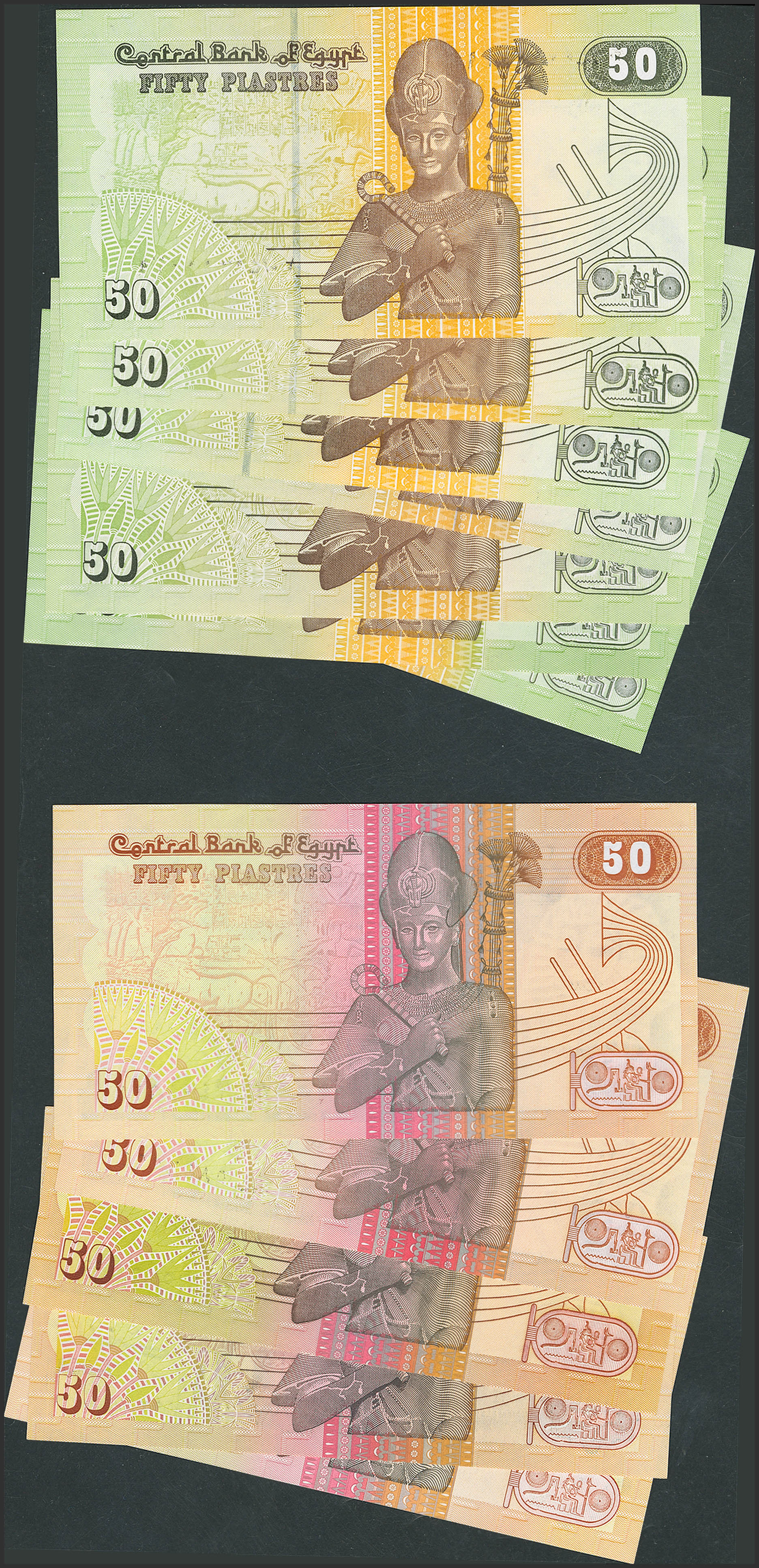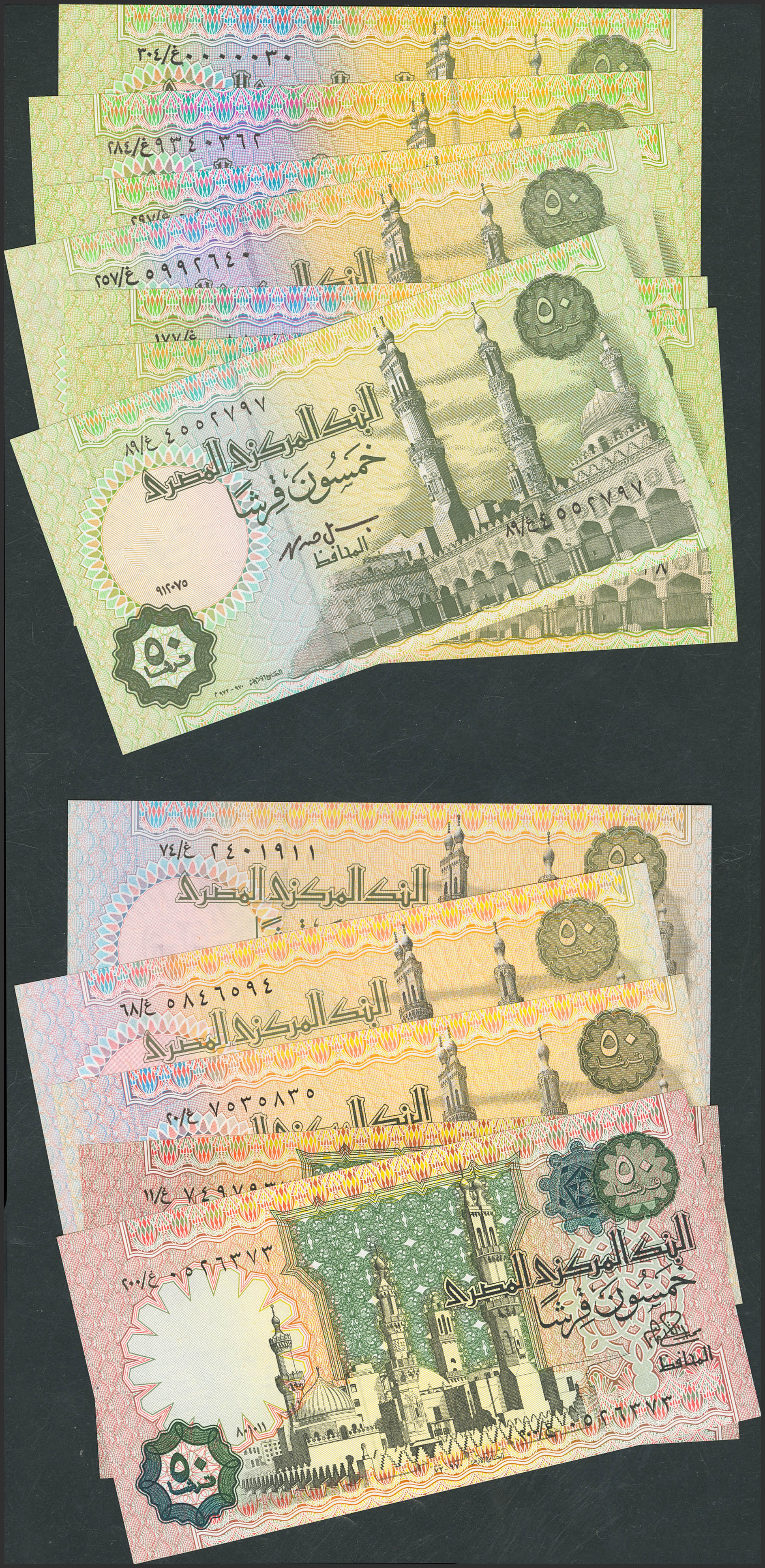 EGYPT. Lot of 12 notes of 50 Piastres. 1981 to 2008. Central Bank. Replacement note include. (Pick: 55a, 55br, 58a, 58c(2), 62c(2), 62g, 62l, 62n(2), 62o). Uncirculated.