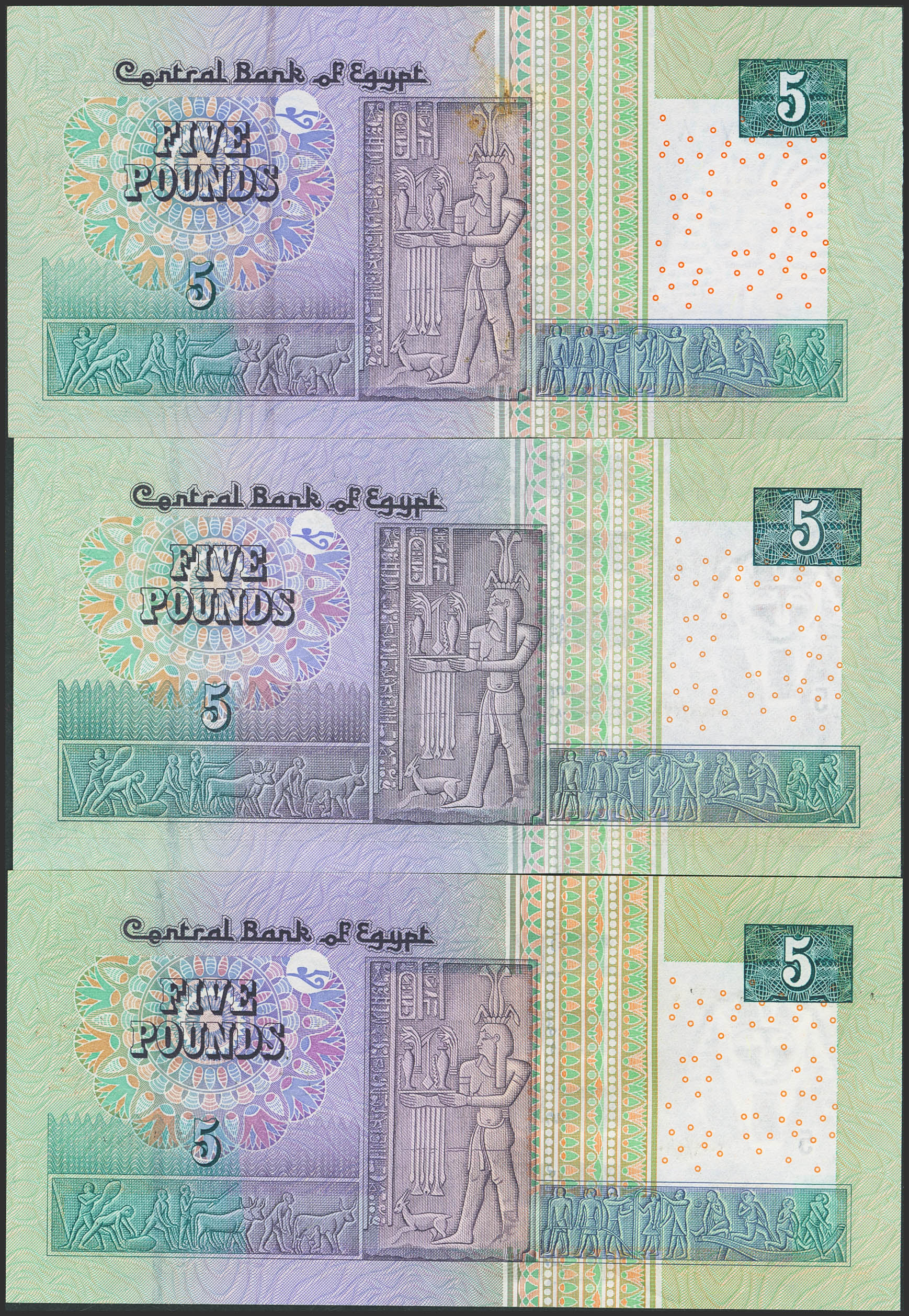 EGYPT. Lot of 3 notes of 5 Pounds. 2002 to 2012. Central Bank. (Pick: 63a, 63c(2)). Almost Uncirculated (1) and Uncirculated (2).