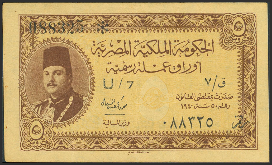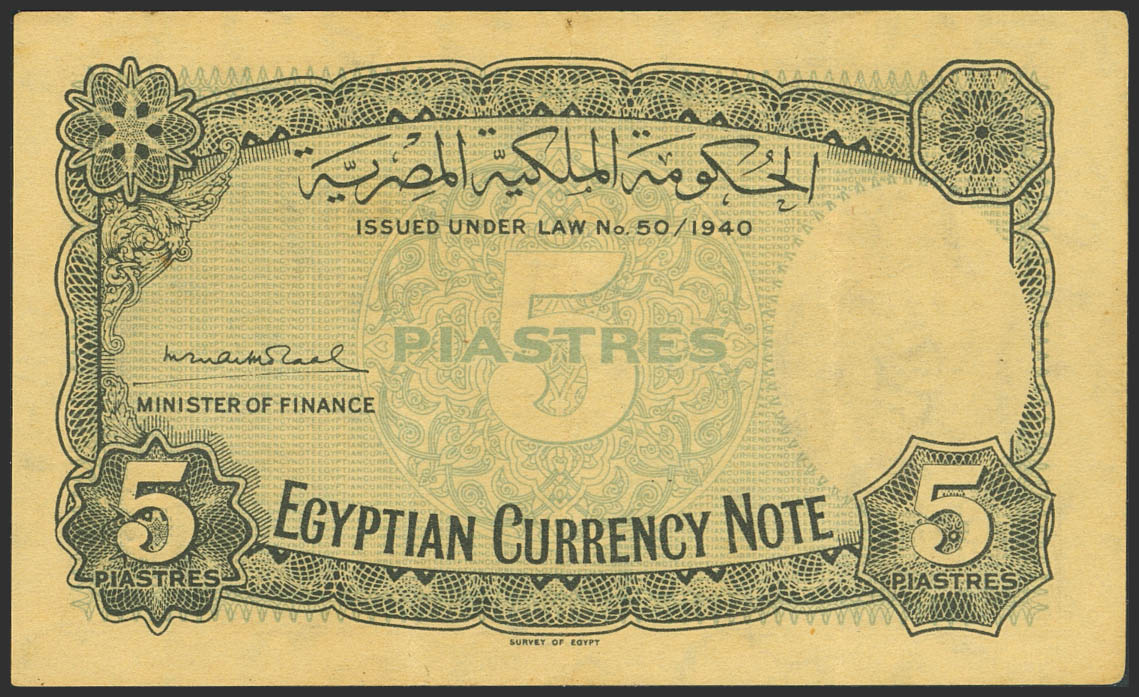 EGYPT. 5 Piastres. 1940. Royal Government. (Pick: 165a). Extremely Fine.