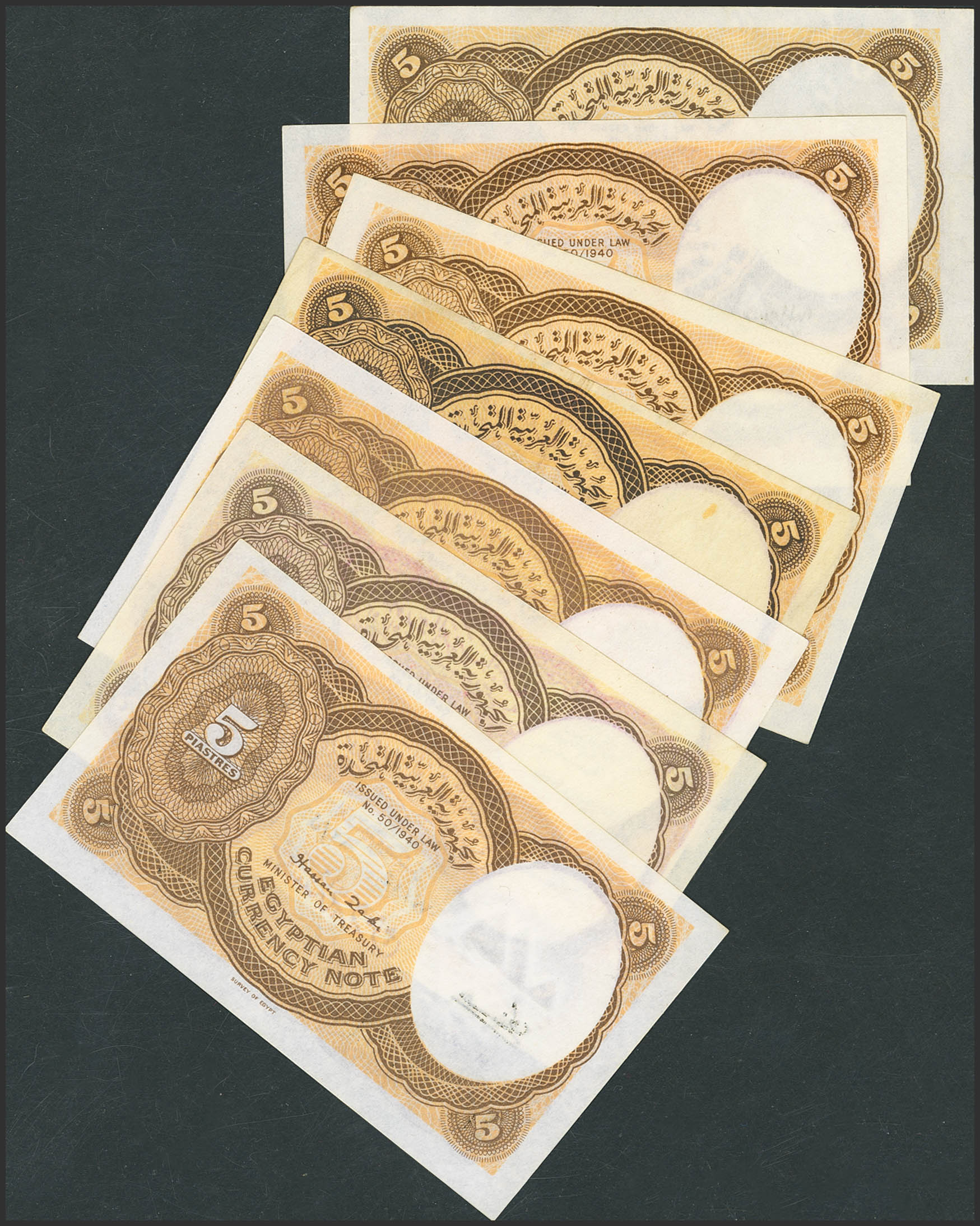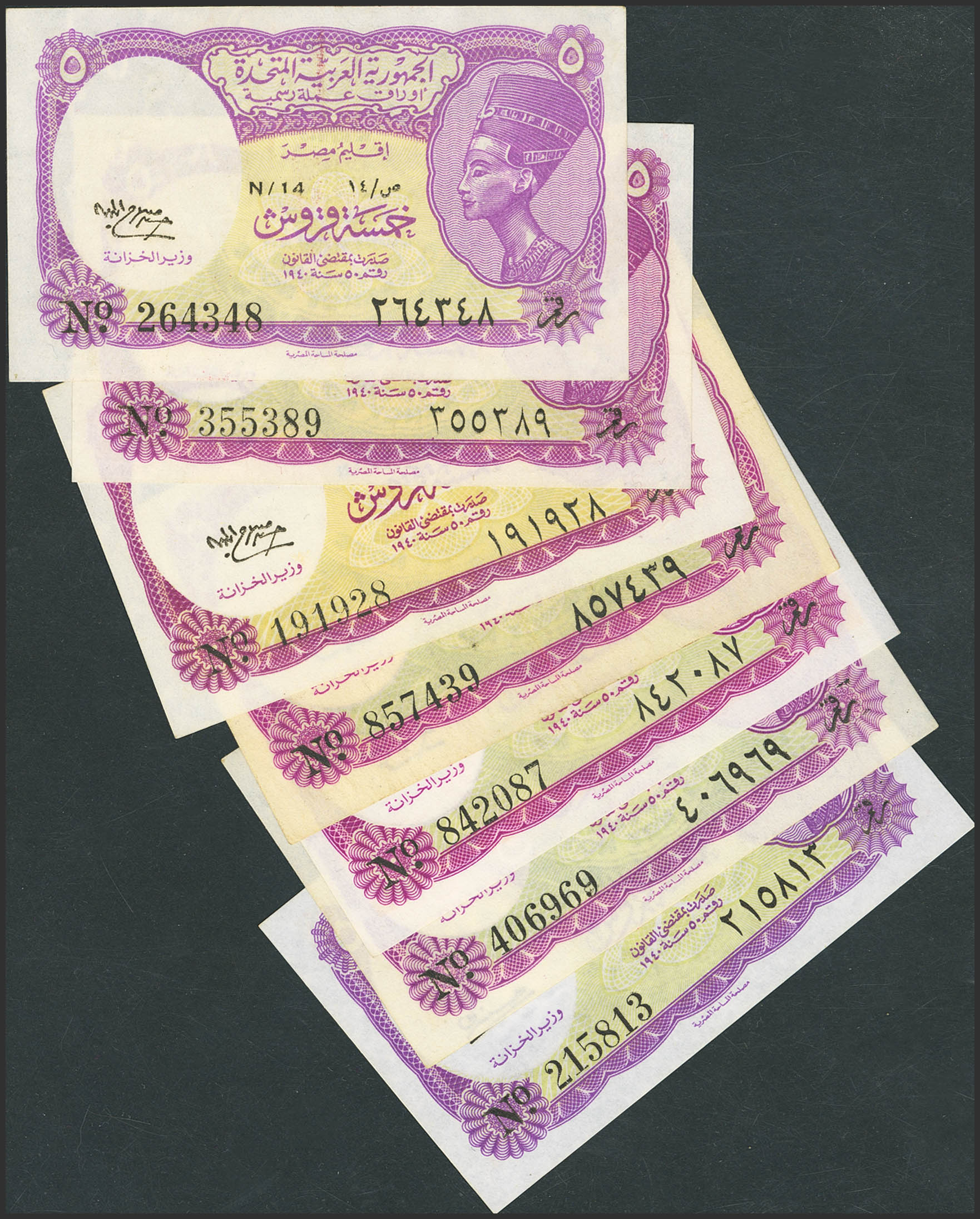 EGYPT. Lot of 7 notes of 5 Piastres. 1940. United Arab Republic. Mixed subreferences. (Pick: 176). Extremely Fine to Less than Uncirculated.
