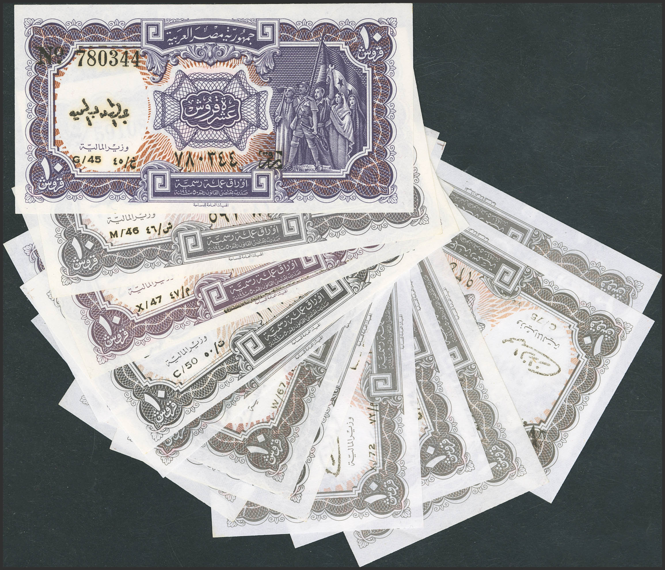 EGYPT. Lot of 14 notes of 10 Piastres. 1940. Arab Republic. Mixed subreferences. (Pick: 183, 184b). Almost Uncirculated (1) and Uncirculated (13).