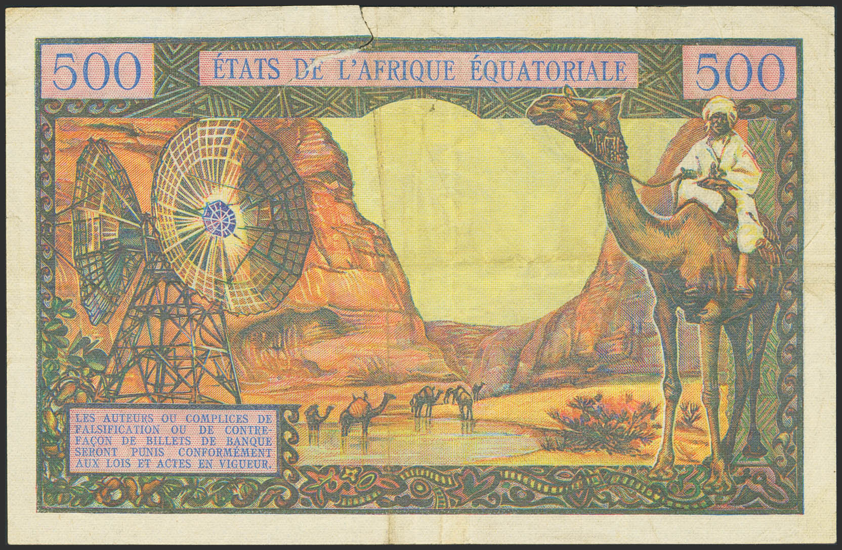 EQUATORIAL AFRICAN STATES. 500 Francs. (1963ca). Banque Centrale. Central African Republic. (Pick: 4f). 3 cm tear at the top edge. Very Fine.