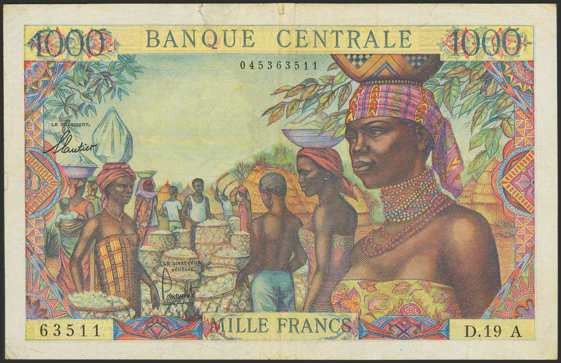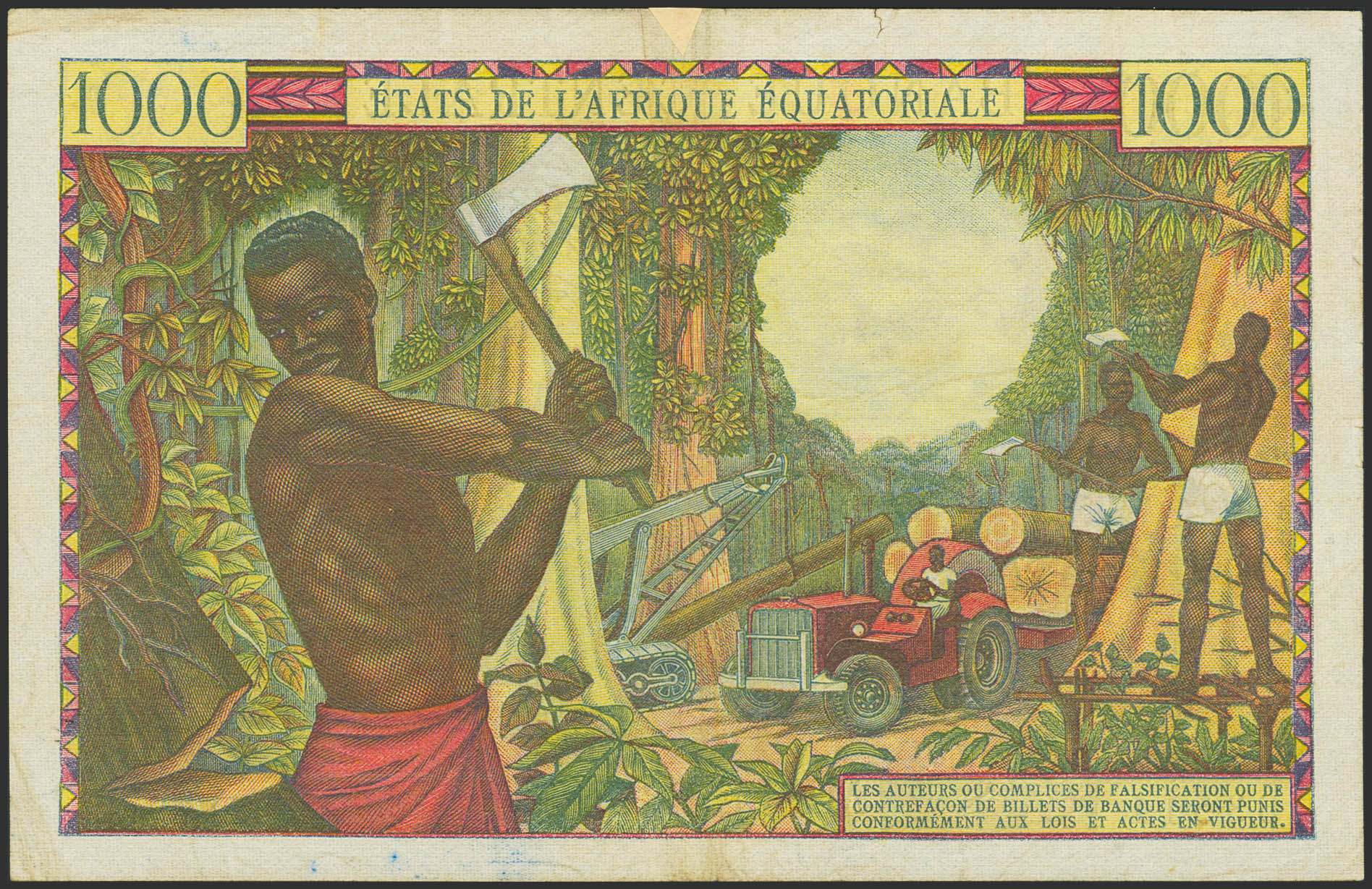 EQUATORIAL AFRICAN STATES. 1000 Francs. (1963ca). Banque Centrale. Chad. (Pick: 5a). Adhesive paper added over tears on upper edge. More than Fine.