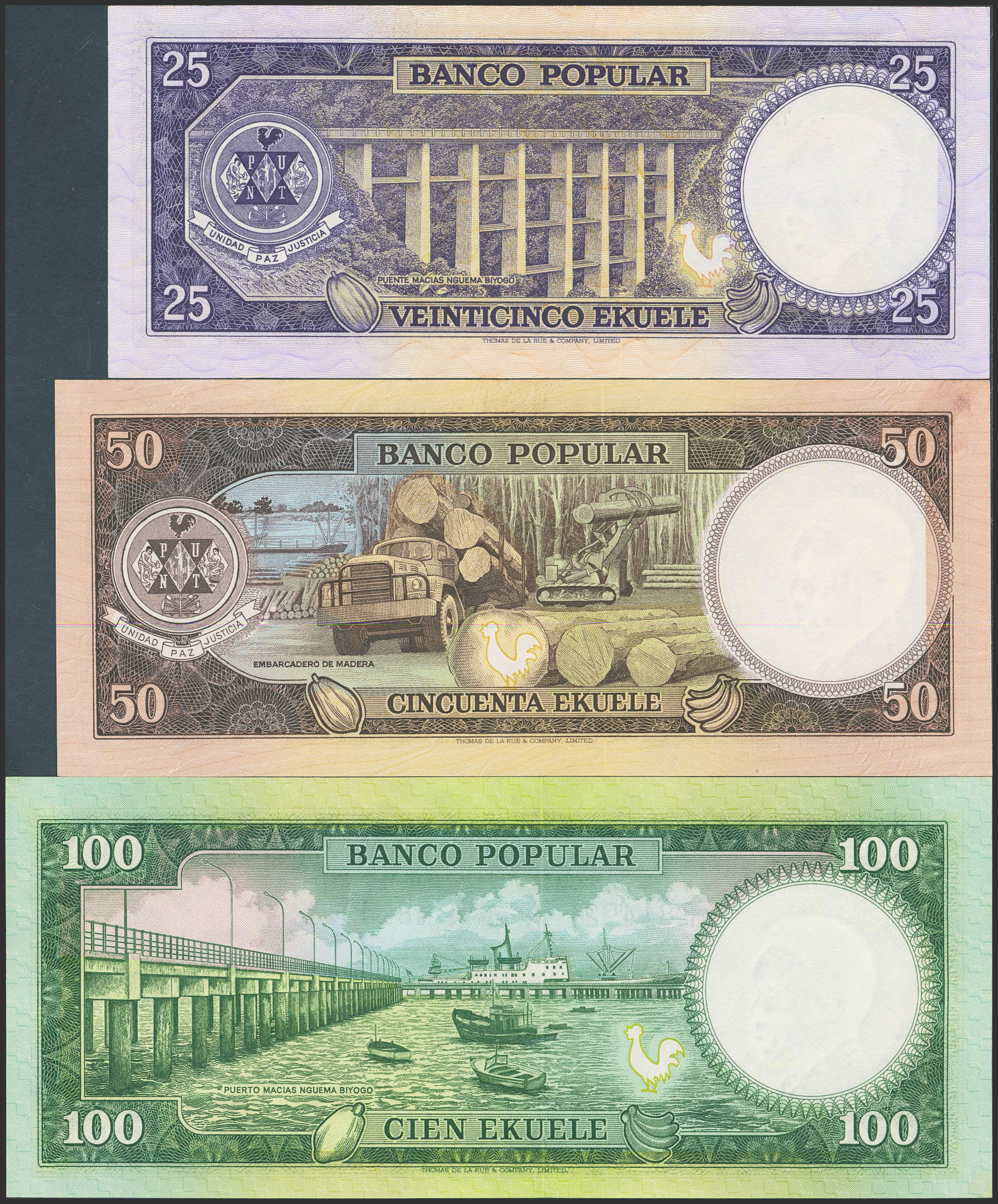EQUATORIAL GUINEA. Lot of 3 notes of 25, 50 and 100 Ekuele. 7 July 1975. Banco Popular. (Pick: 4, 5, 6). Uncirculated.