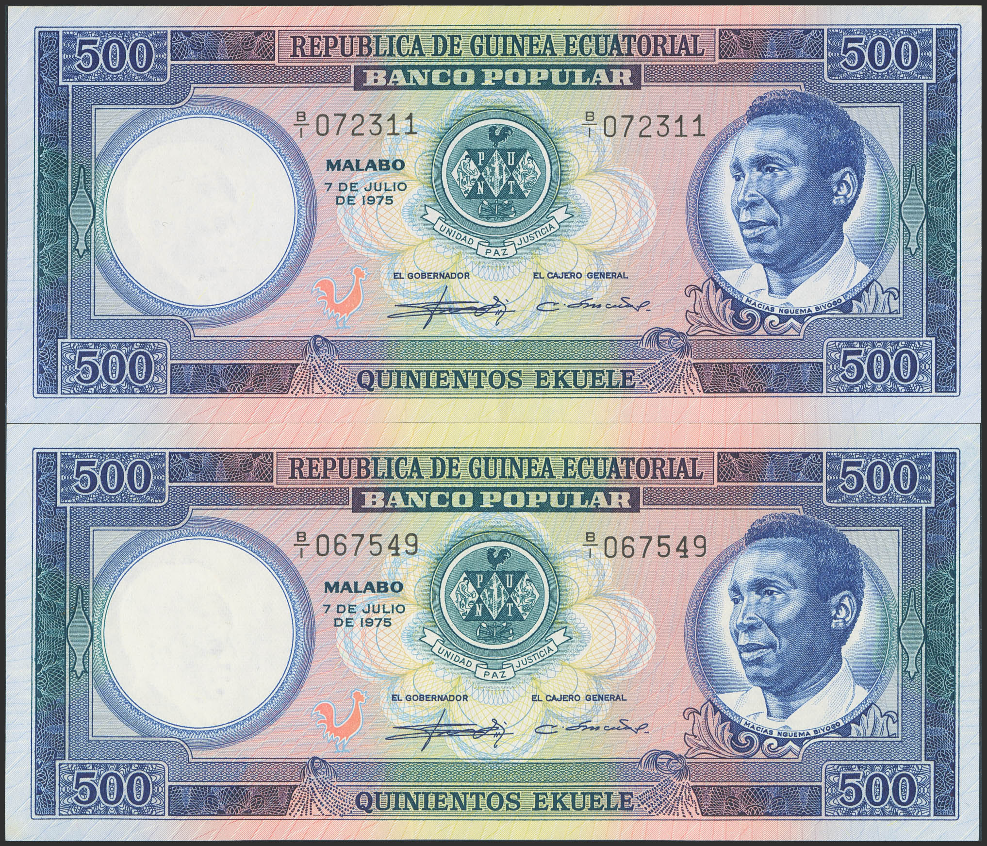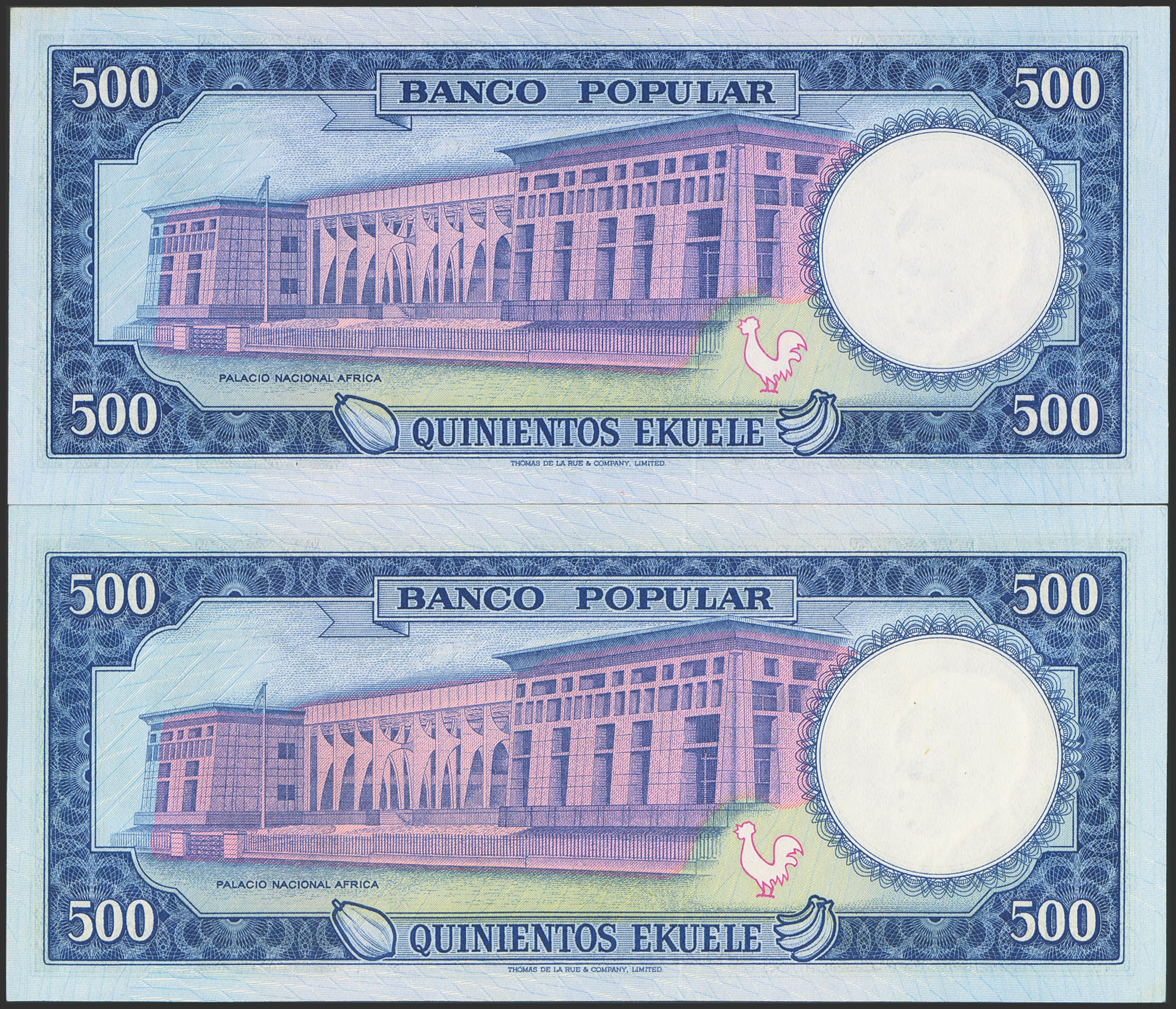 EQUATORIAL GUINEA. Lot of 2 notes of 500 Ekuele. 7 July 1975. Banco Popular. (Pick: 7). Less than Uncirculated.