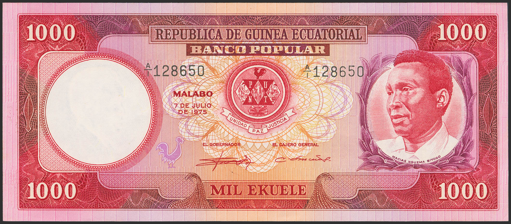 EQUATORIAL GUINEA. 1000 Ekuele. 7 July 1975. Banco Popular. (Pick: 8). Less than Uncirculated.