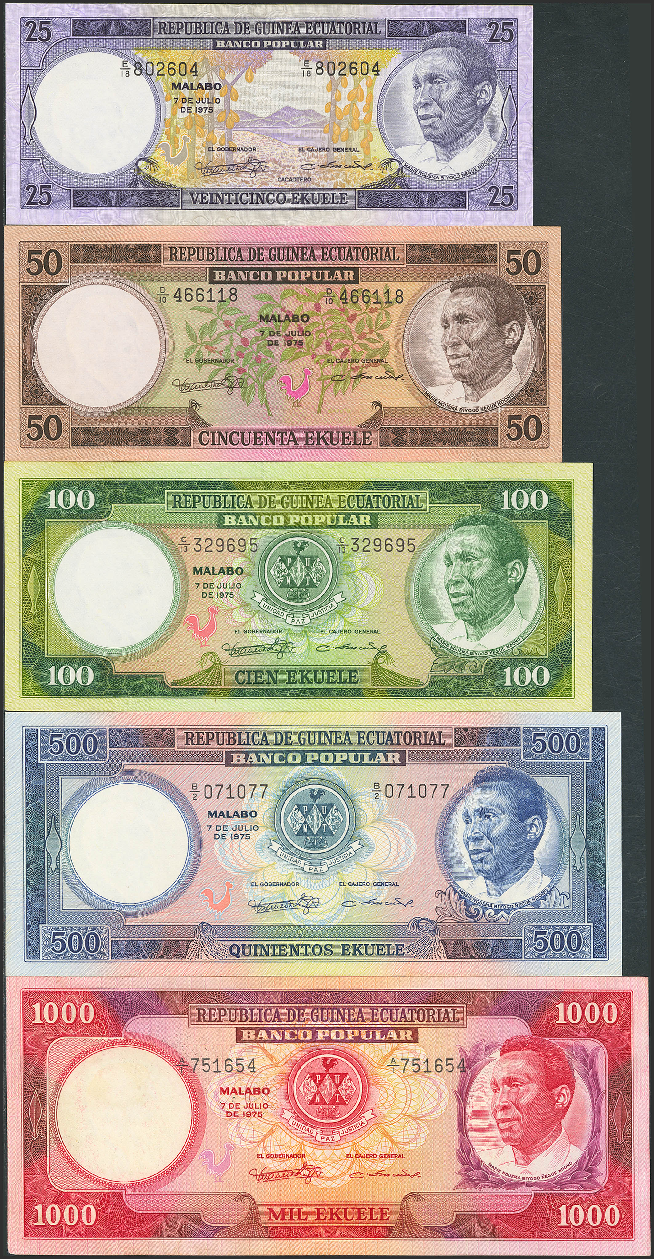 EQUATORIAL GUINEA. Complete set of 5 notes from 25 to 1000 Ekuele. 7 July 1975. Banco Popular. (Pick: 9, 10, 11, 12, 13). Uncirculated (4) and Less than Uncirculated (1).
