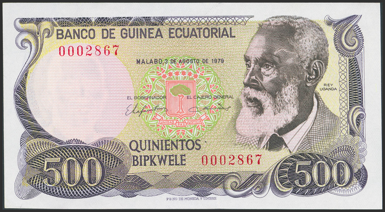 EQUATORIAL GUINEA. 500 Bipkwele. 3 August 1979. Banco de Guinea Ecuatorial. (Pick: 15). 4 pinholes. Almost Uncirculated.