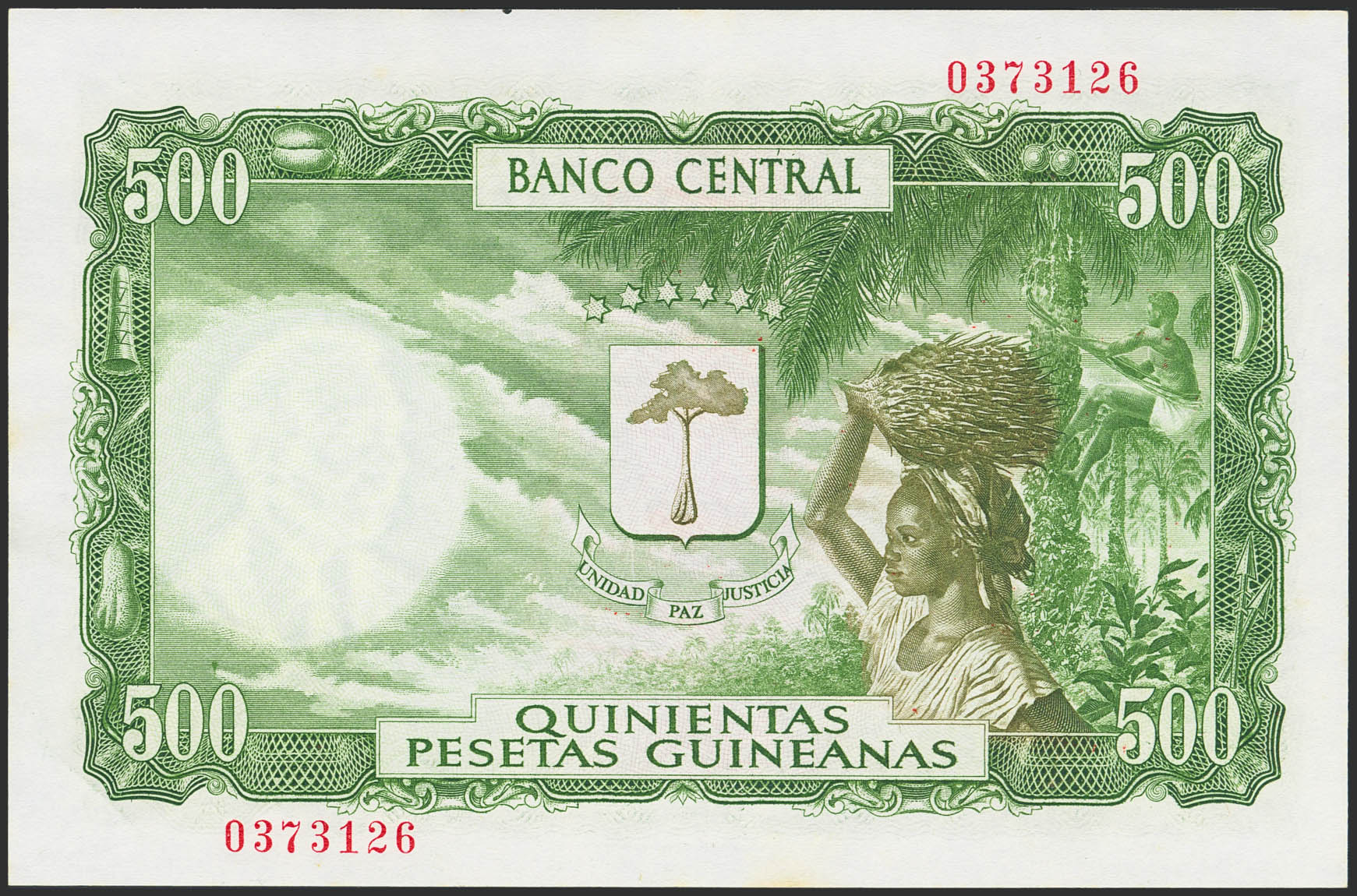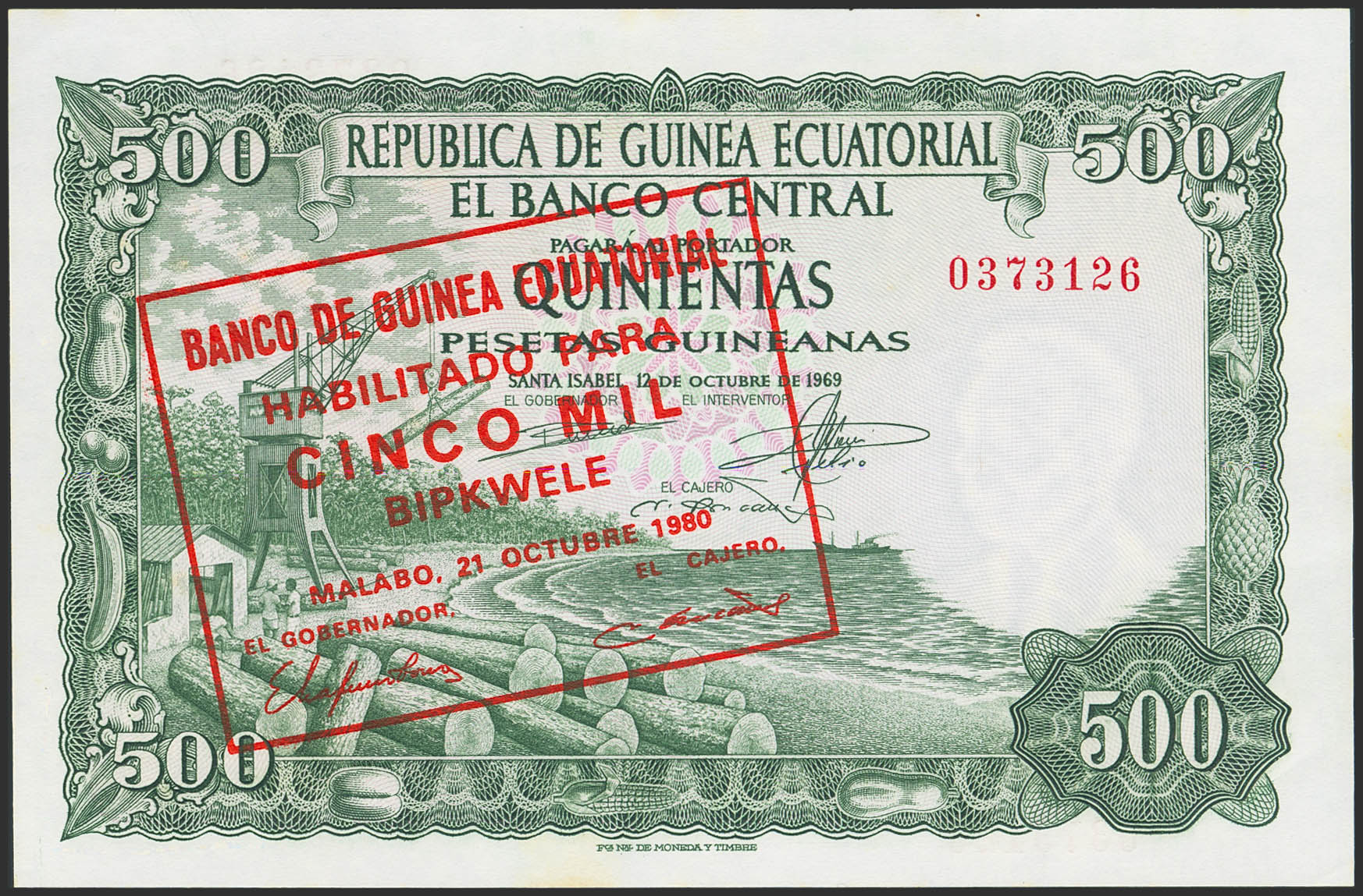 EQUATORIAL GUINEA. 5000 Bipkwele. 21 October 1980. Banco de Guinea Ecuatorial. (Pick: 19). Handling marks. Less than Uncirculated.