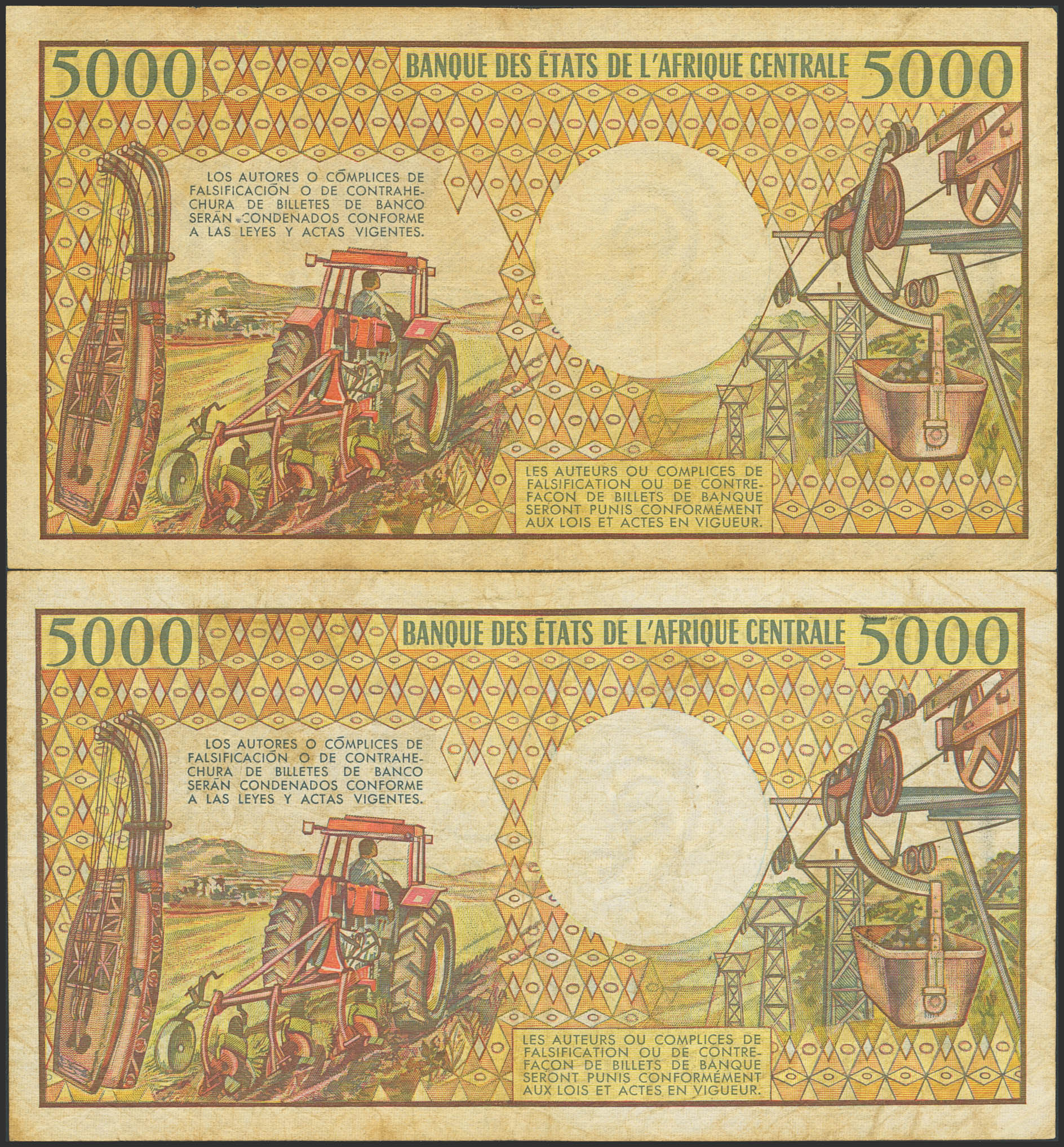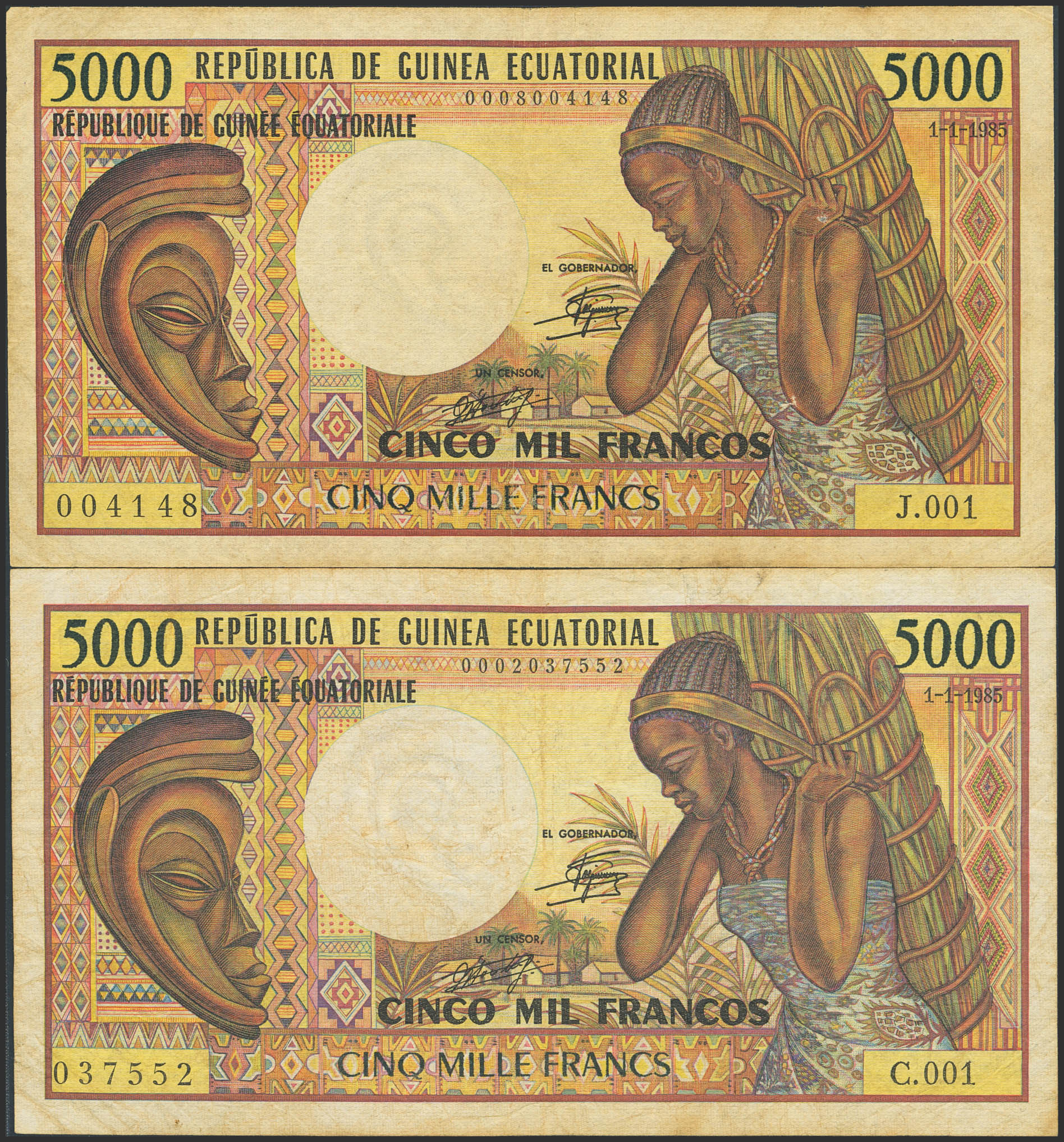 EQUATORIAL GUINEA. Lot of 2 notes of 5000 Francs. 1 January 1985. Banque des Etats de l'Afrique Centrale. República de Guinea Ecuatorial. (Pick: 22a). Pinhole. Very Fine.