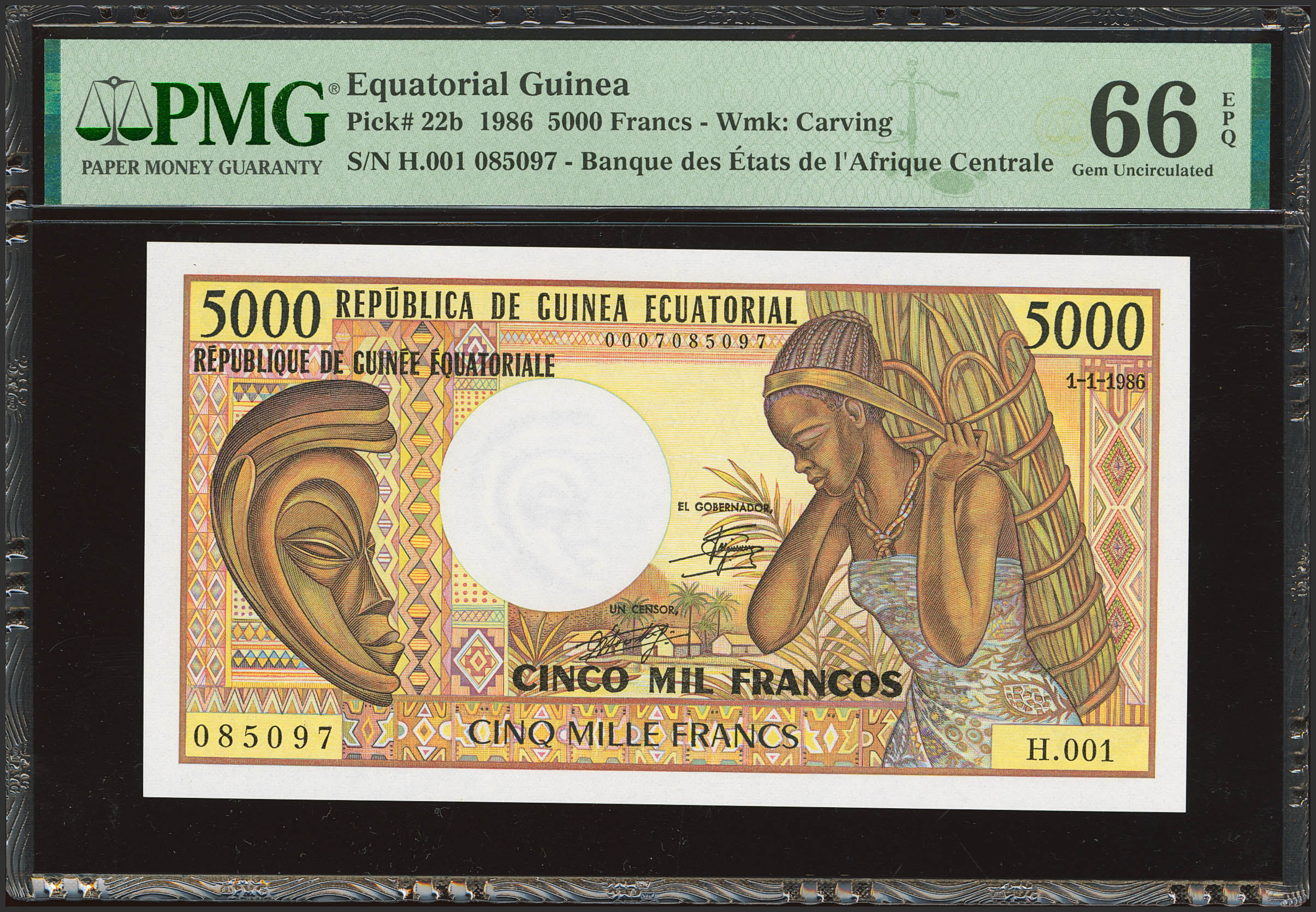 EQUATORIAL GUINEA. 5000 Francs. 1 January 1986. Banque des Etats de l'Afrique Centrale. República de Guinea Ecuatorial. (Pick: 22b). PMG66EPQ.