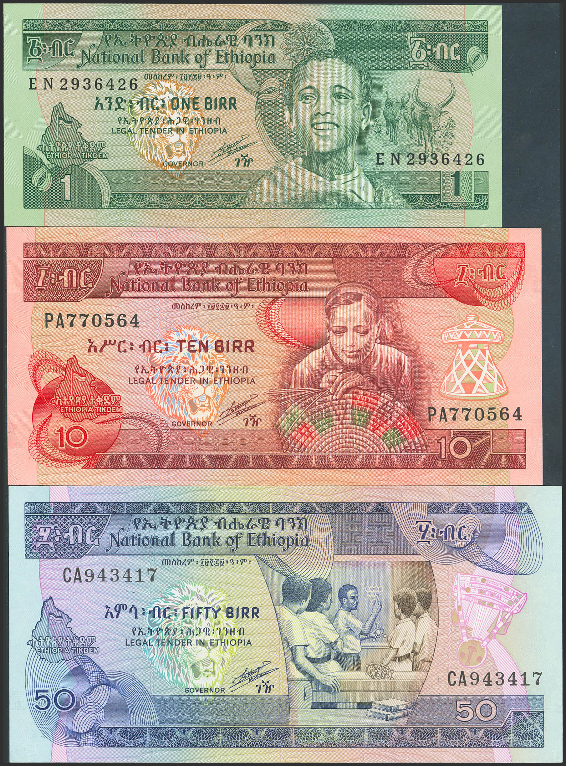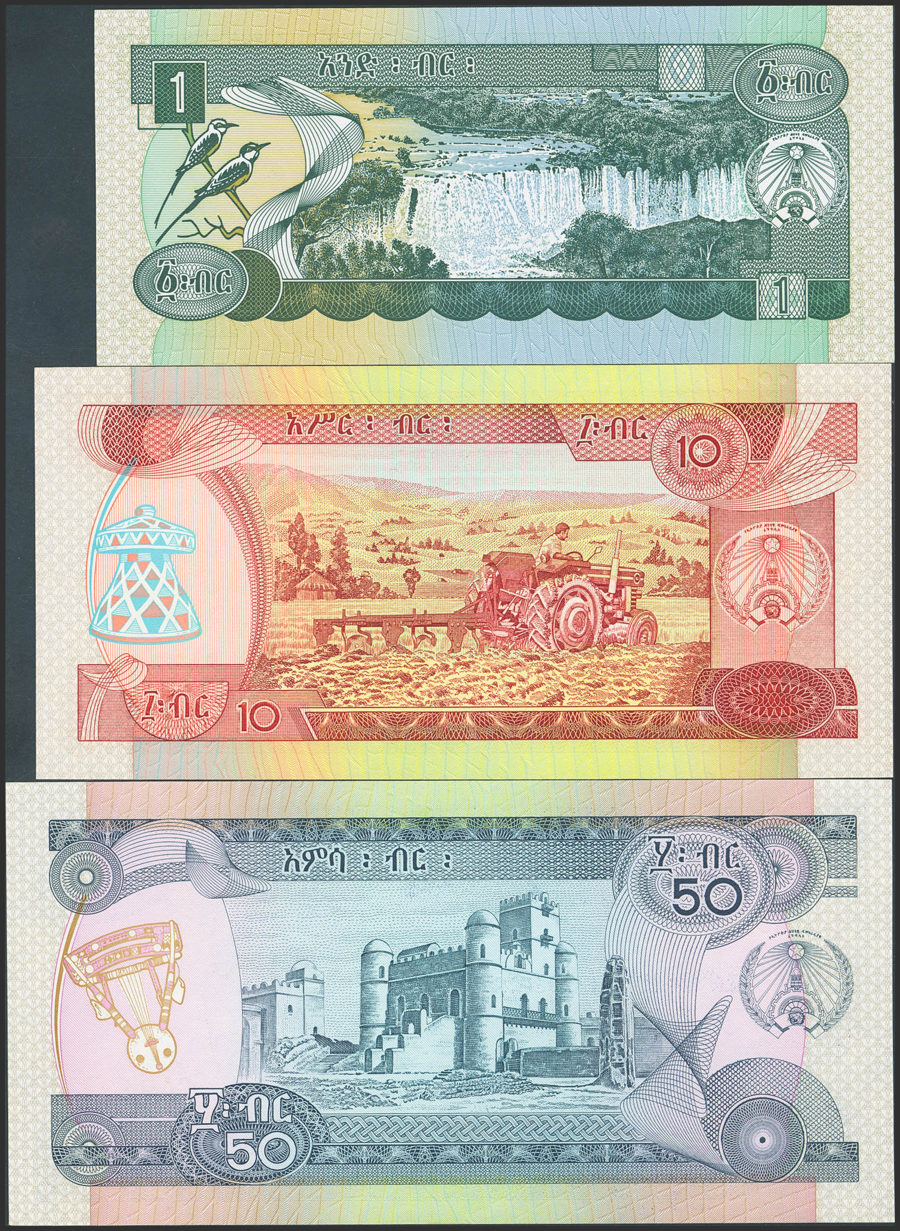 ETHIOPIA. Lot of 3 notes from 1 to 50 Birr. (1966ca). National Bank. (Pick: 41b, 43b, 44c). Uncirculated.