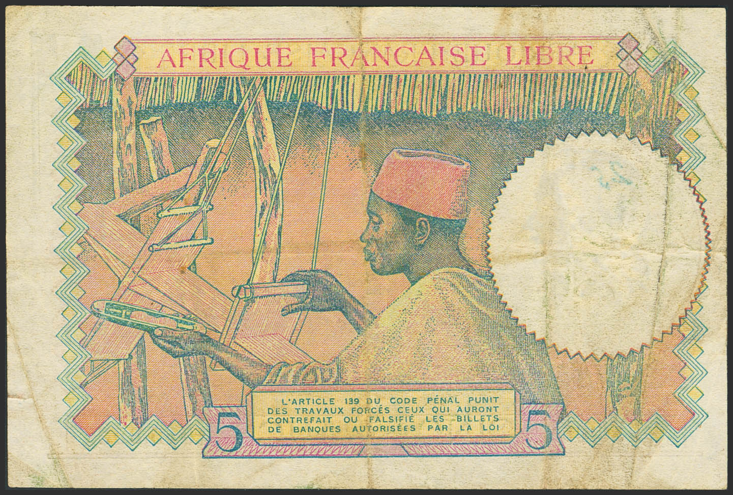 FRENCH EQUATORIAL AFRICA. 5 Francs. (1941ca). Afrique Francaise Libre. (Pick: 6). Ink annotation in pen. Very Fine.