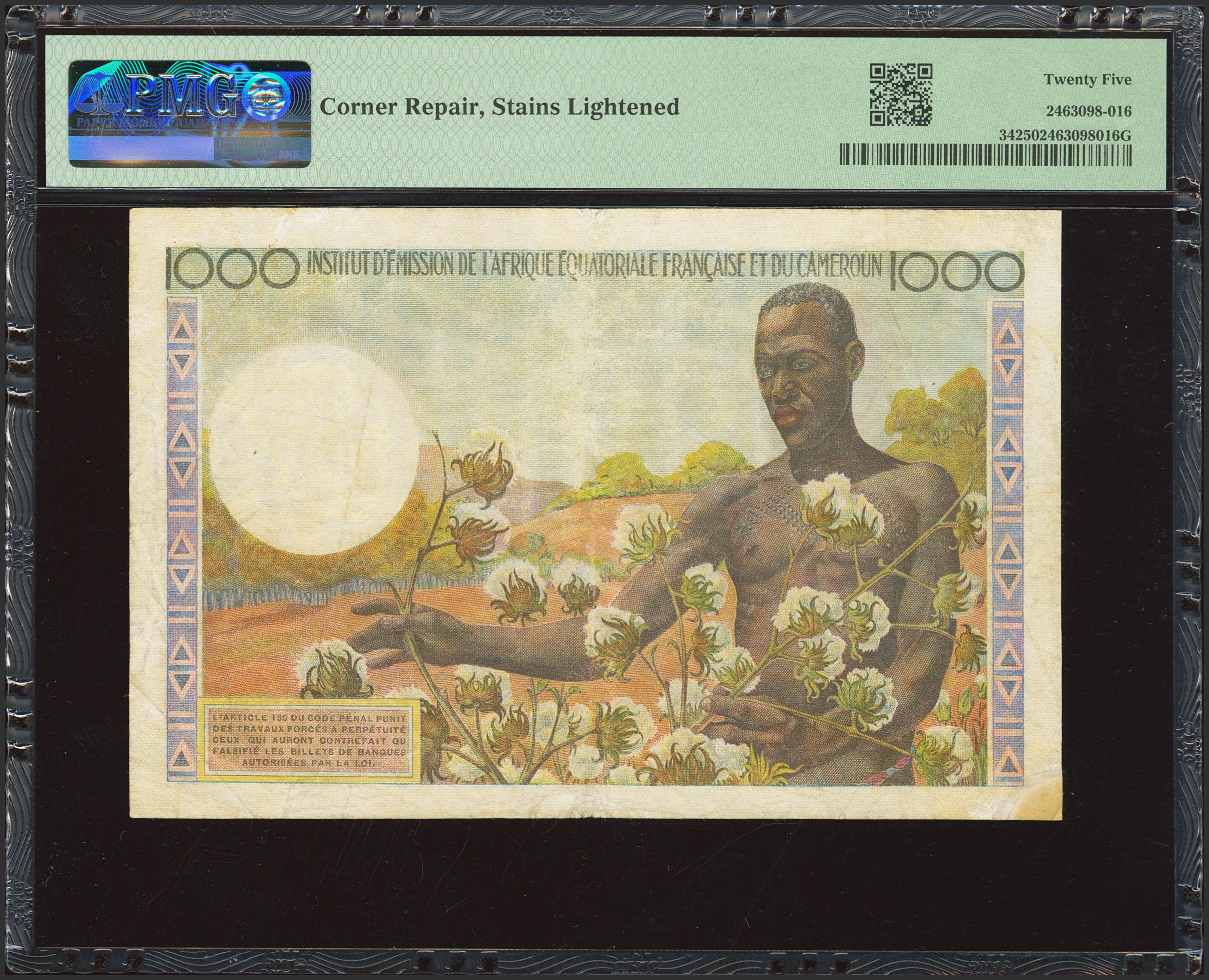 FRENCH EQUATORIAL AFRICA. 1000 Francs. (1957ca). Institut d'Emission de l'Afrique Equatoriale Francaise et du Cameroun. (Pick: 34). PMG25 (corner repair, stains lightened).
