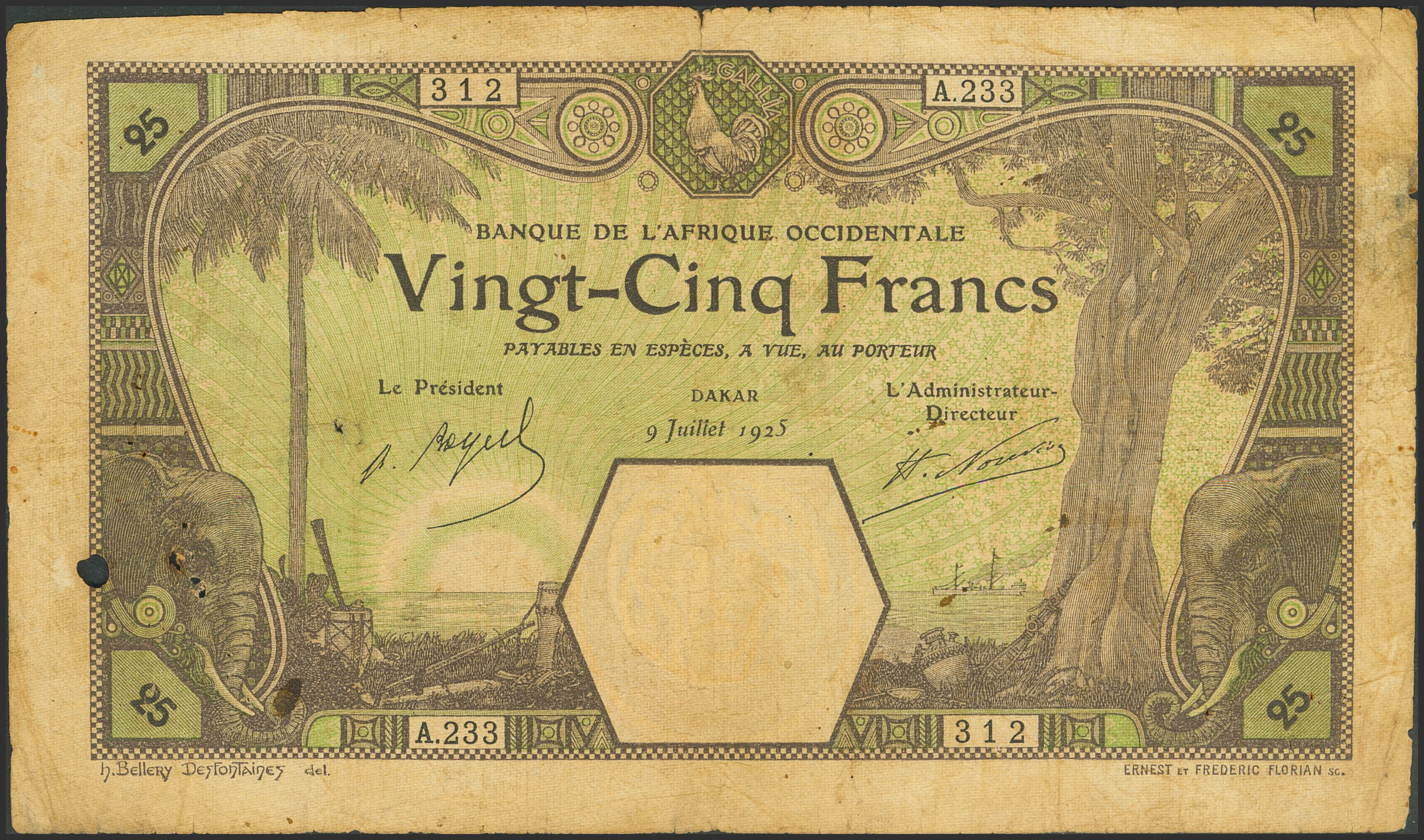 FRENCH WEST AFRICA. 25 Francs. 9 July 1925. Banque de l'Afrique Occidentale. Dakar. (Pick: 7Bb). Wormhole and pinholes. Fine.