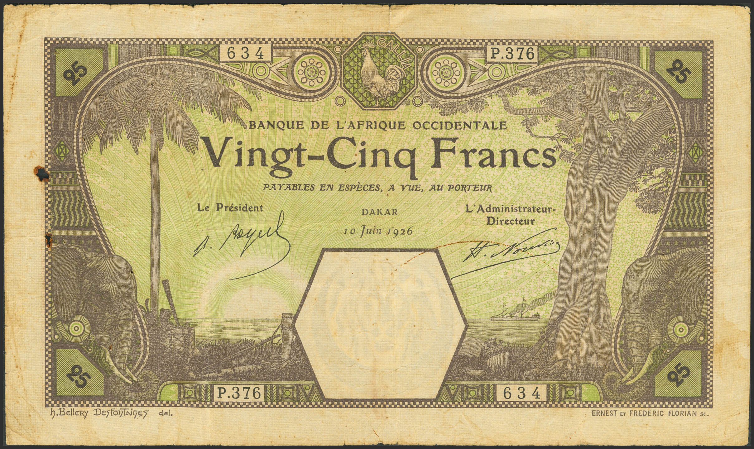 FRENCH WEST AFRICA. 25 Francs. 10 June 1926. Banque de l'Afrique Occidentale. Dakar. (Pick: 7Bc). Wormhole and pinholes. Very Fine.