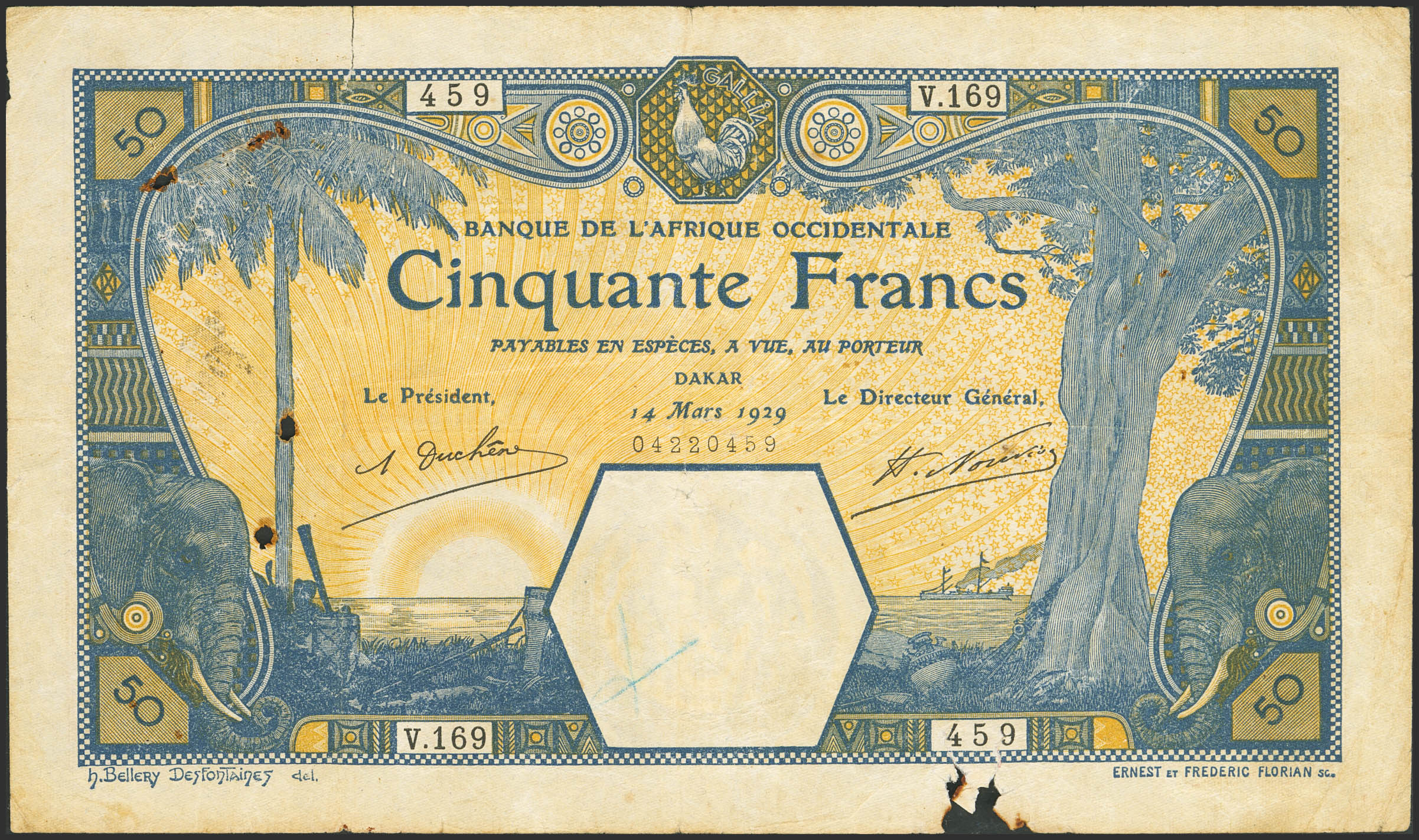 FRENCH WEST AFRICA. 50 Francs. 14 March 1929. Banque de l'Afrique Occidentale. Dakar. (Pick: 9Bc). Multiple rust holes and missing part of lower edge. Fine.