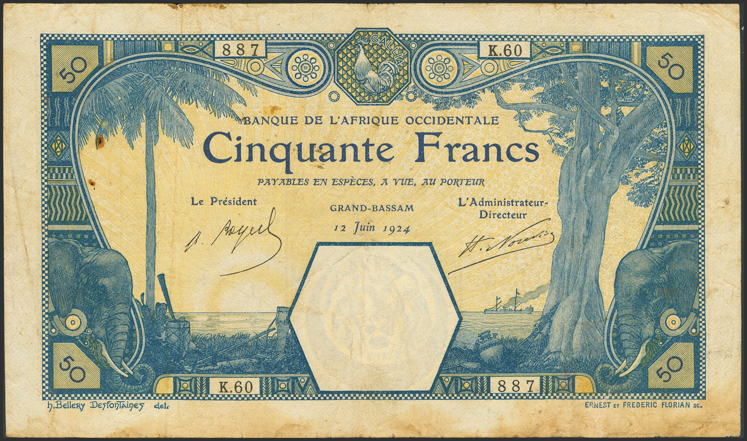 FRENCH WEST AFRICA. 50 Francs. 12 June 1924. Banque de l'Afrique Occidentale. Grand-Bassam. (Pick: 9Db). Rusty pinholes. More than Fine.