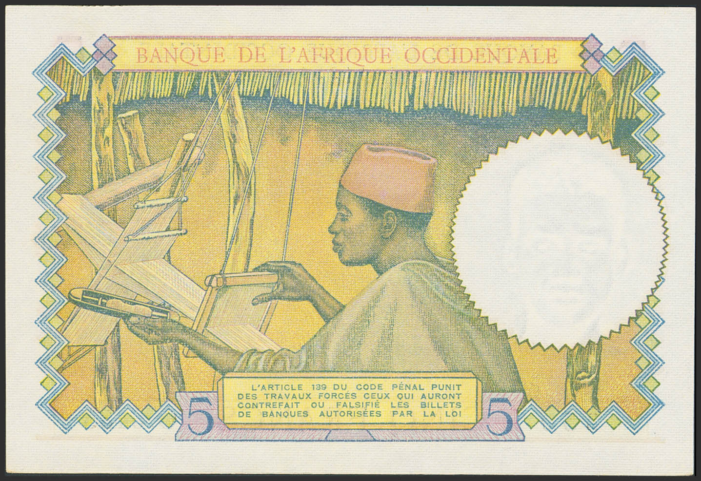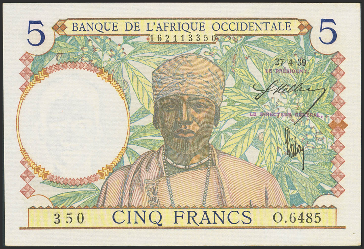 FRENCH WEST AFRICA. 5 Francs. 27 April 1939. Banque de l'Afrique Occidentale. (Pick: 21). Uncirculated.