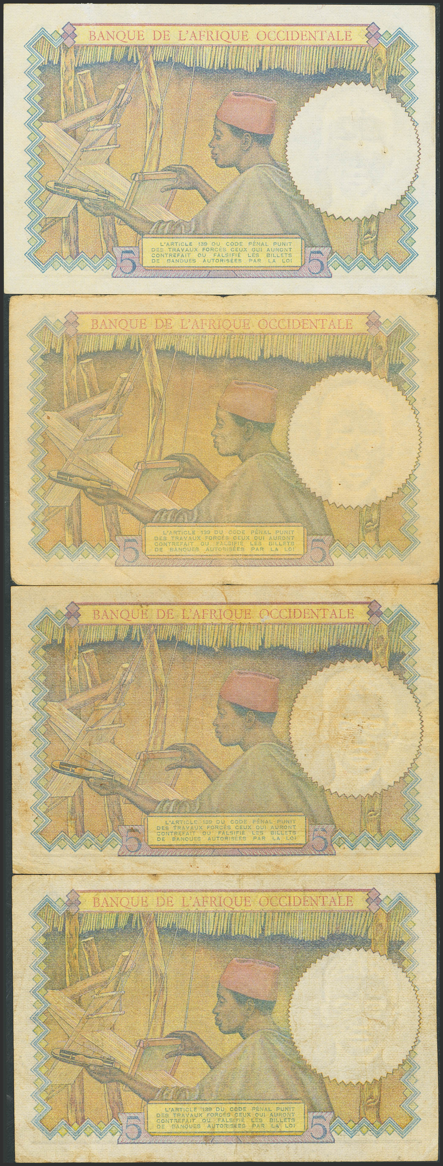FRENCH WEST AFRICA. Lot of 4 notes of 5 Francs. 6 March 1941. Banque de l'Afrique Occidentale. (Pick: 25). Very Fine to Almost Uncirculated.