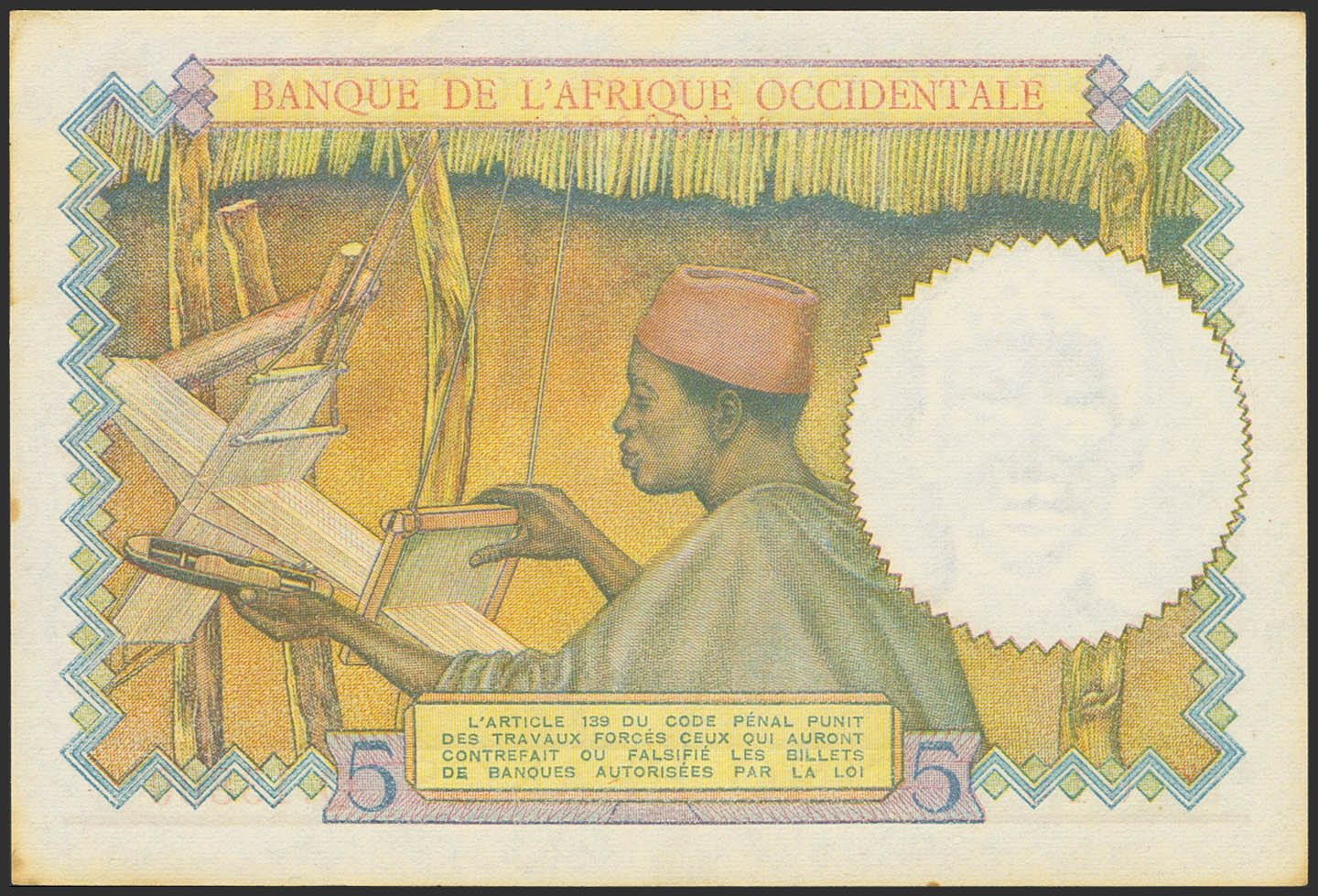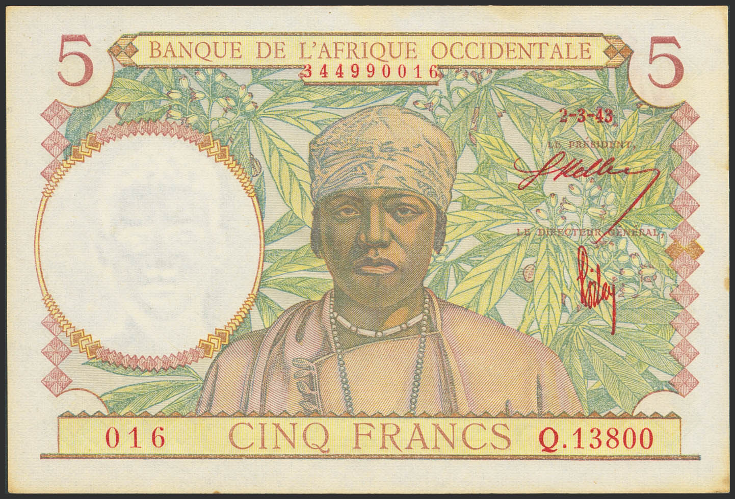 FRENCH WEST AFRICA. 5 Francs. 2 March 1943. Banque de l'Afrique Occidentale. (Pick: 26). Rust on edges and corners. Less than Uncirculated.