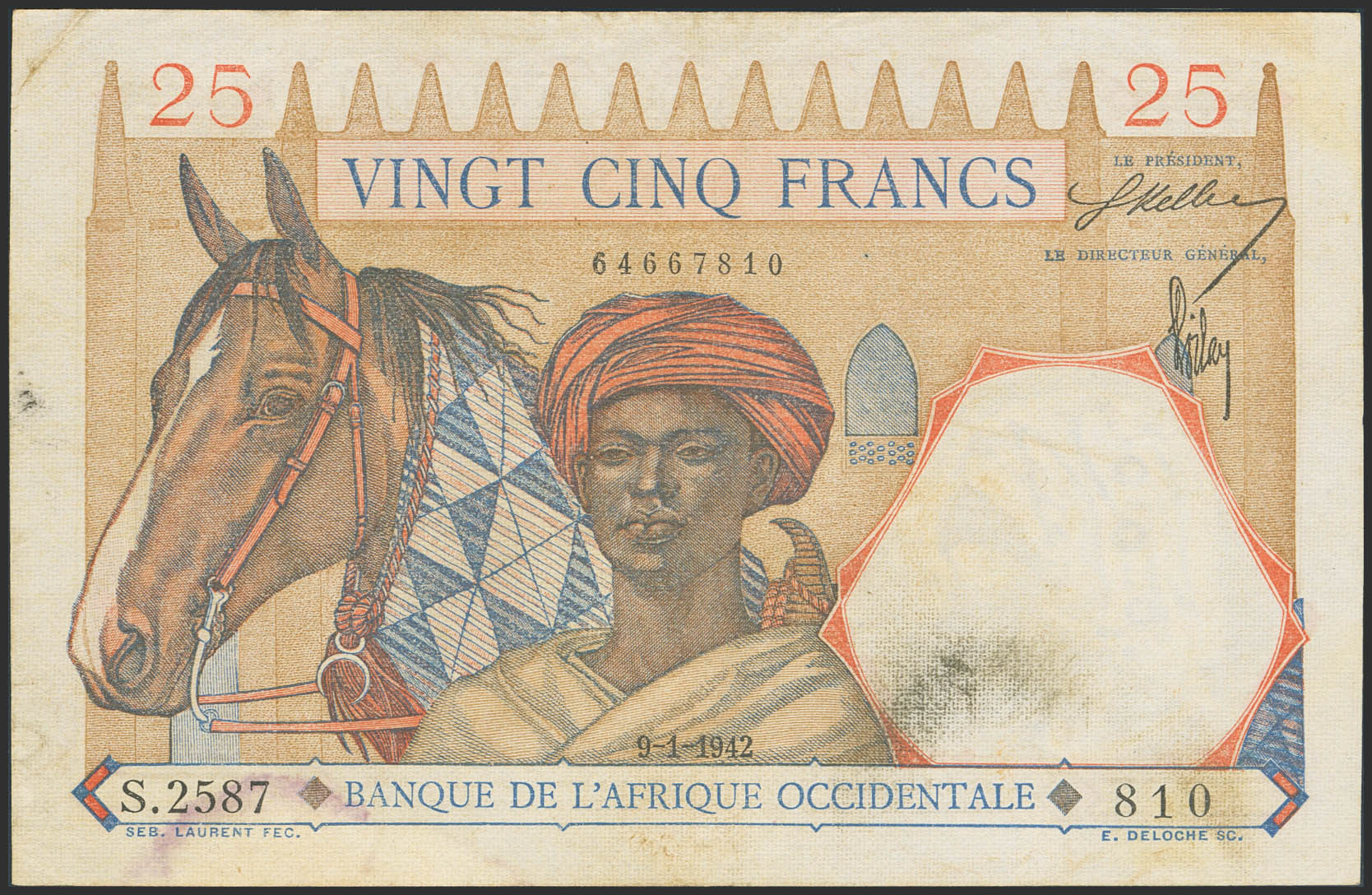 FRENCH WEST AFRICA. 25 Francs. 9 January 1942. Banque de l'Afrique Occidentale. (Pick: 27). Dirty. Extremely Fine.
