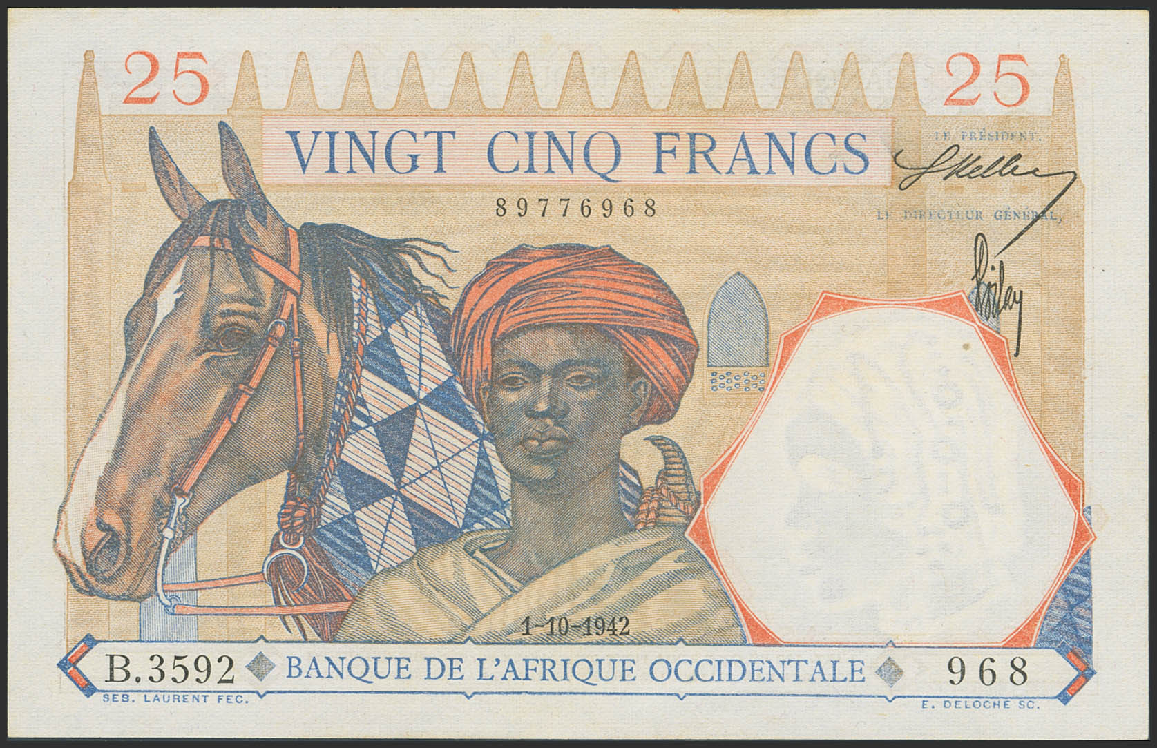FRENCH WEST AFRICA. 25 Francs. 1 October 1942. Banque de l'Afrique Occidentale. (Pick: 27). Flattened. Extremely Fine.