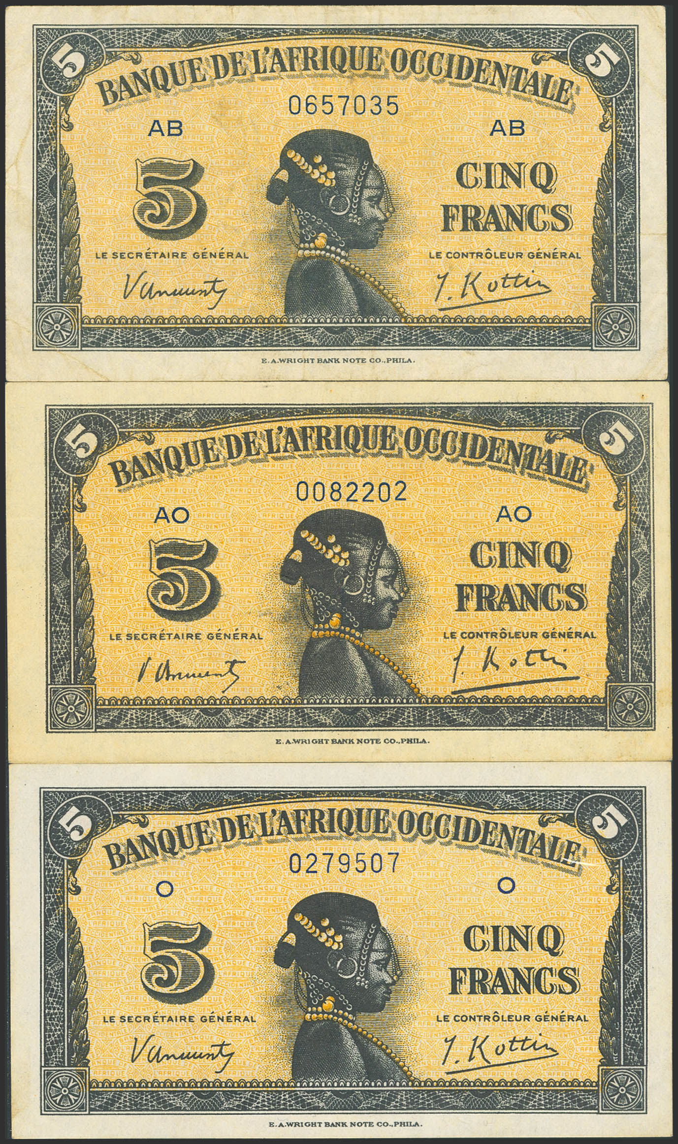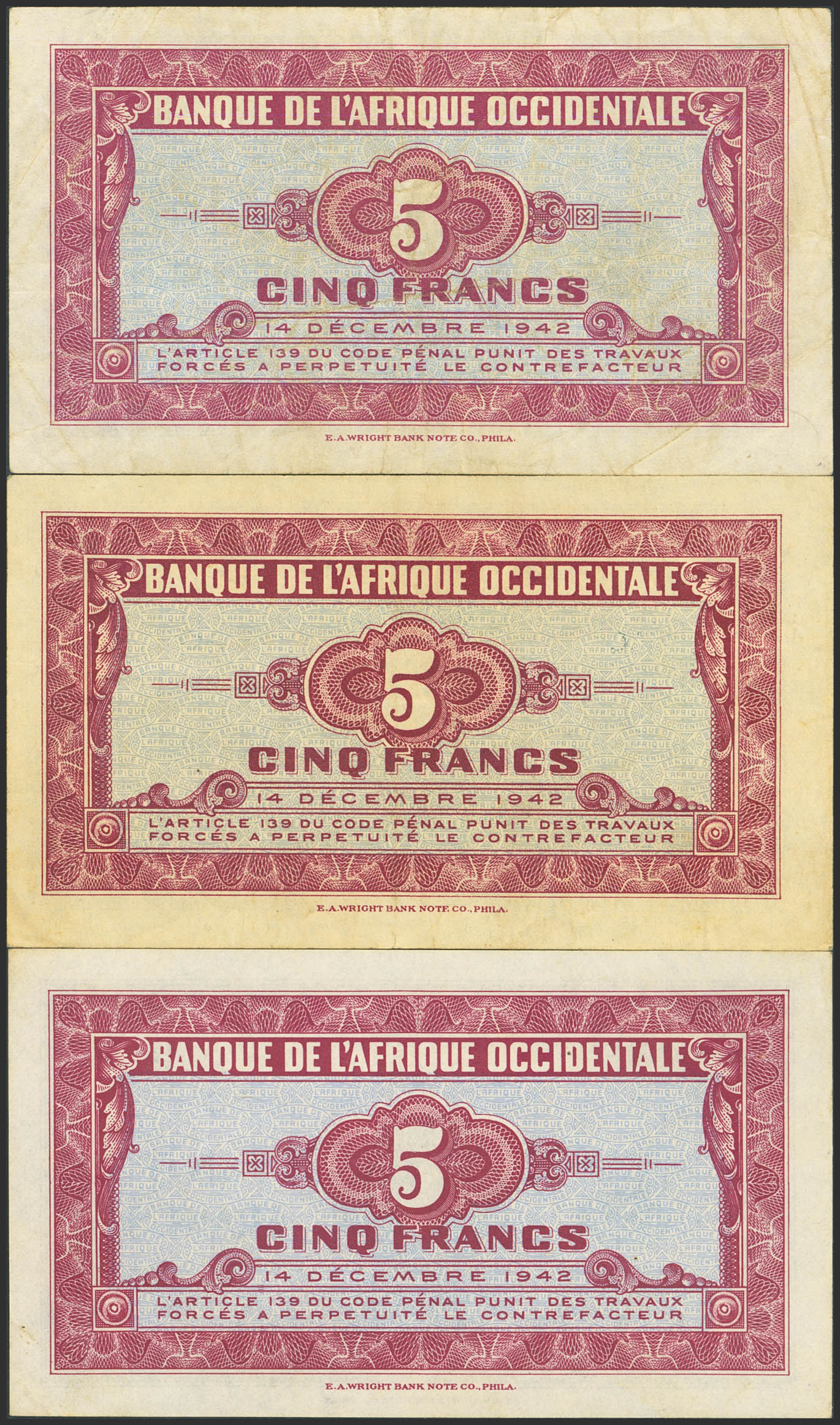 FRENCH WEST AFRICA. Lot of 3 notes of 5 Francs. 14 December 1942. Banque de l'Afrique Occidentale. (Pick: 28a(2), 28b(1)). Less than Uncirculated, More than very fine and More than Extremely Fine.
