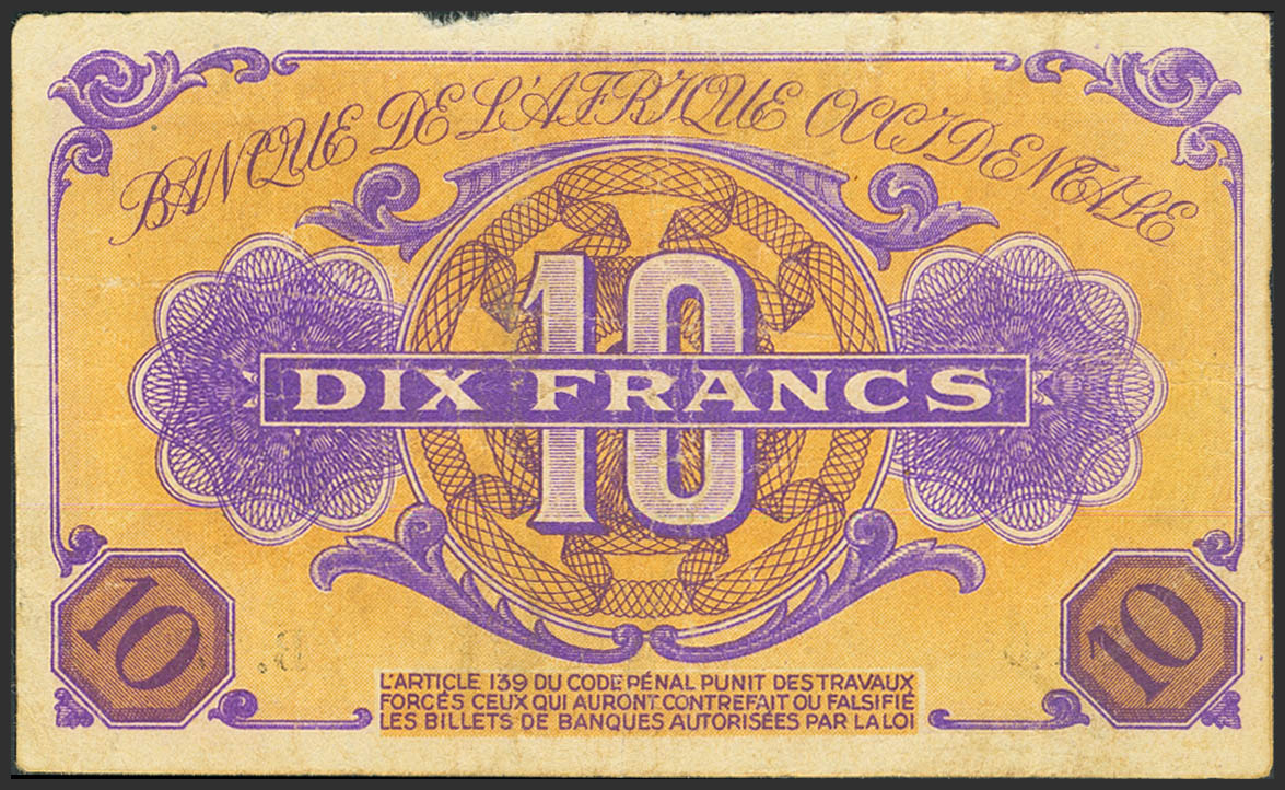 FRENCH WEST AFRICA. 10 Francs. 2 January 1943. Banque de l'Afrique Occidentale. (Pick: 29). Small nick on top. More than Fine.