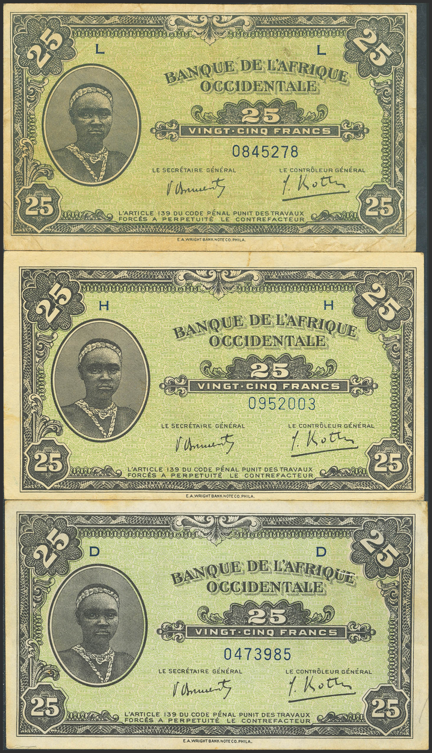 FRENCH WEST AFRICA. Lot of 3 notes of 25 Francs. 14 December 1942. Banque de l'Afrique Occidentale. (Pick: 30a). Almost Uncirculated, More than Very Fine and More than Extremely Fine.
