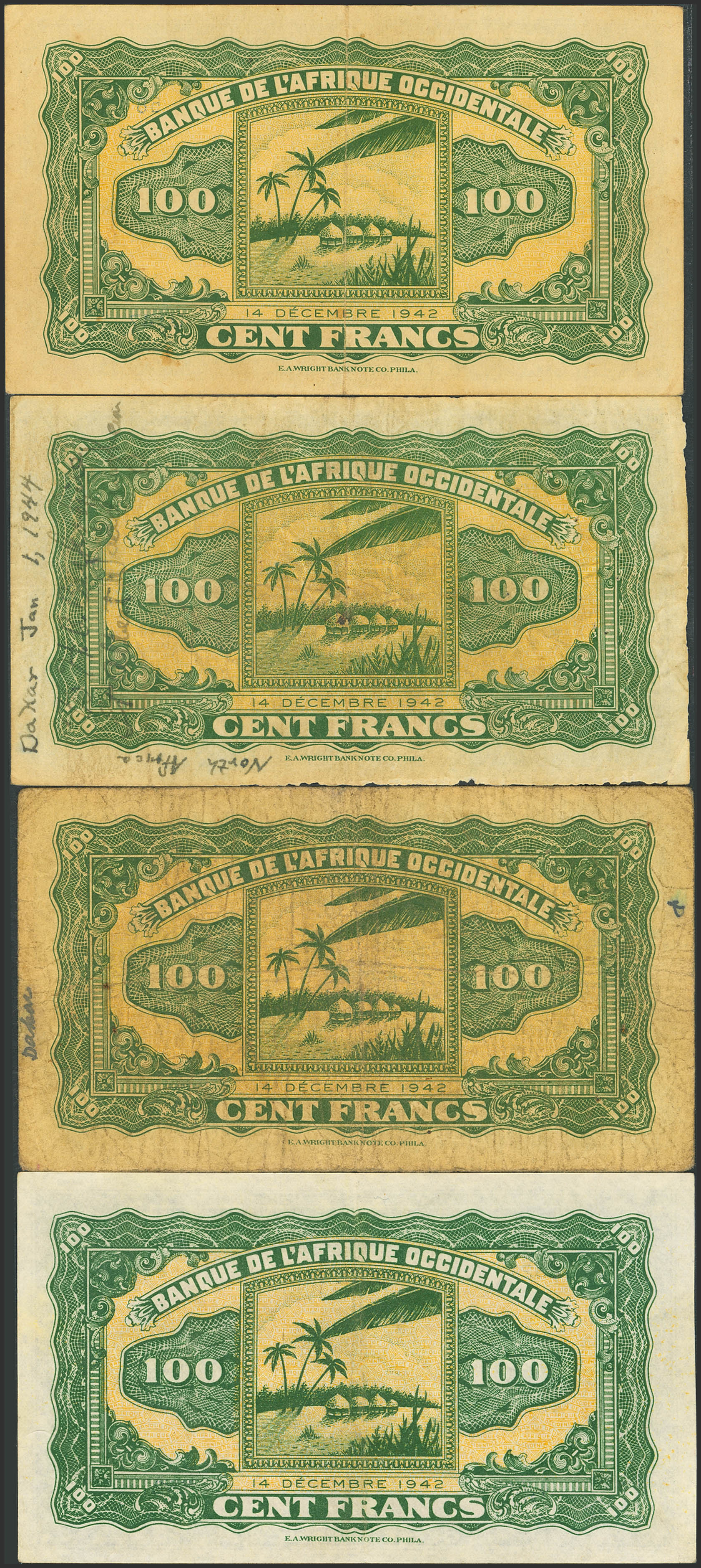 FRENCH WEST AFRICA. Lot of 4 notes of 100 Francs. 14 December 1942. Banque de l'Afrique Occidentale. (Pick: 31a). Fine to More than Extremely Fine.