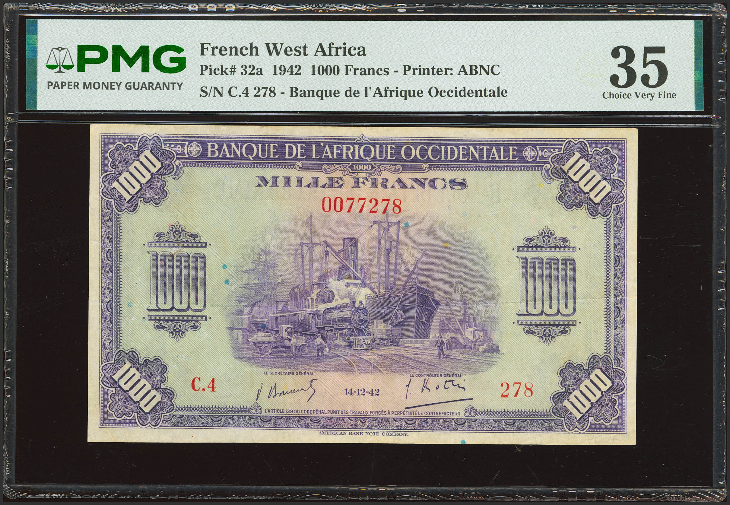 FRENCH WEST AFRICA. 1000 Francs. 14 December 1942. Banque de l'Afrique Occidentale. (Pick: 32). PMG35 (pinholes).