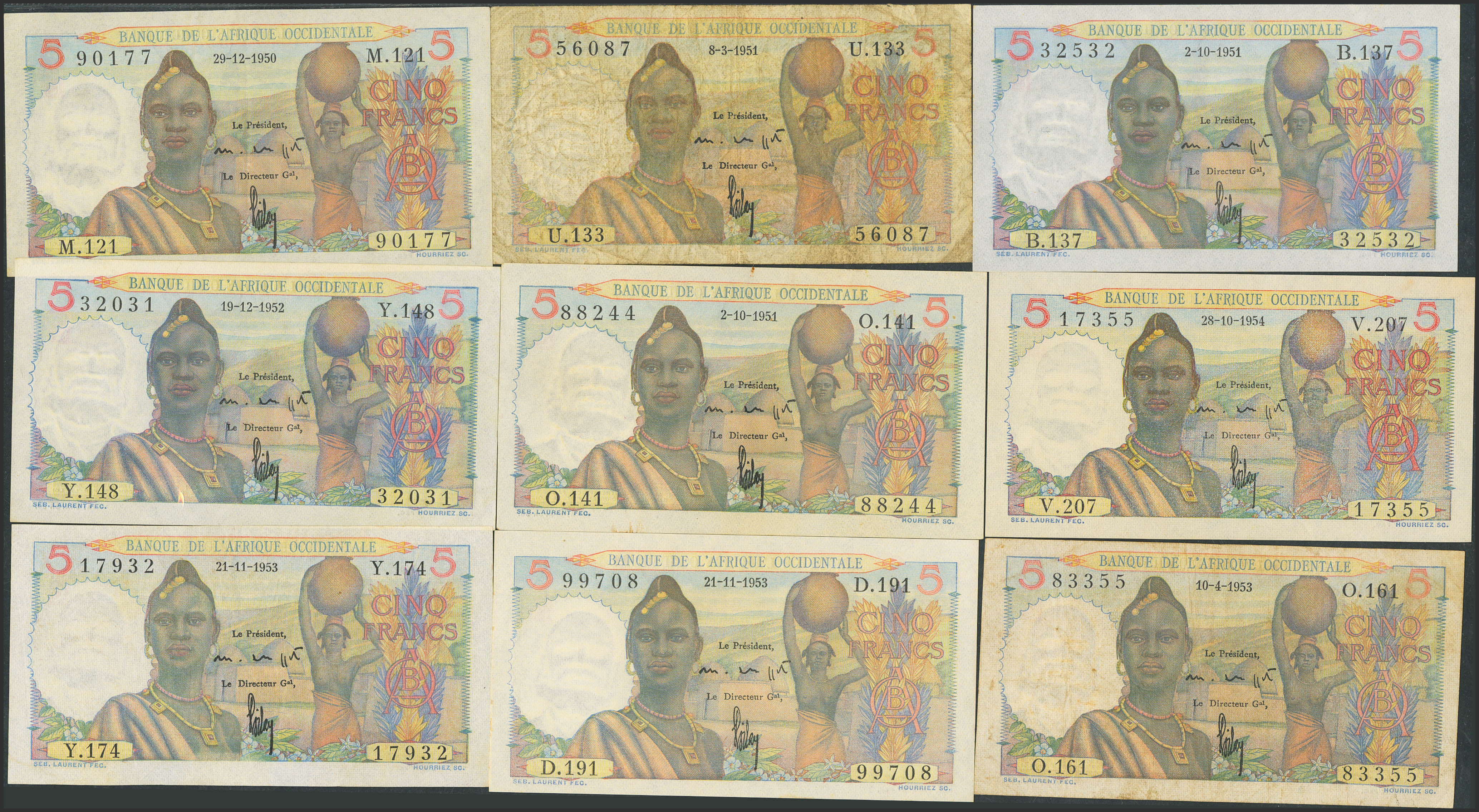 FRENCH WEST AFRICA. Lot of 9 notes of 5 Francs. 1950 to 1954. Banque de l'Afrique Occidentale. Mixed dates. (Pick: 36). Fine (1), Very Fine (2), Almost Uncirculated (1), Less than Uncirculated (3) and Uncirculated (2).