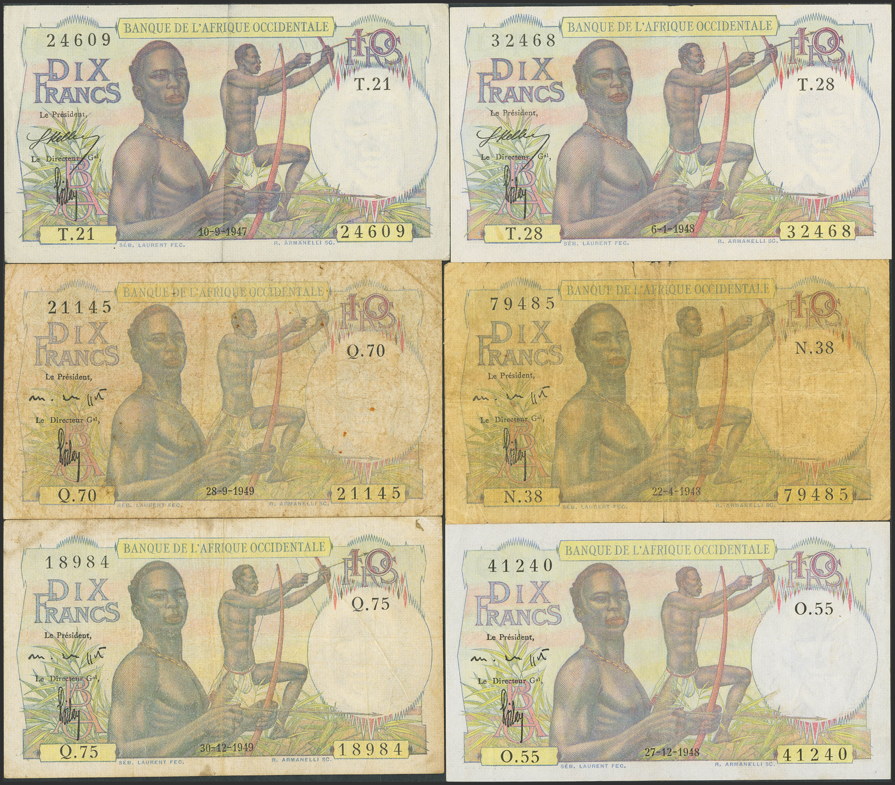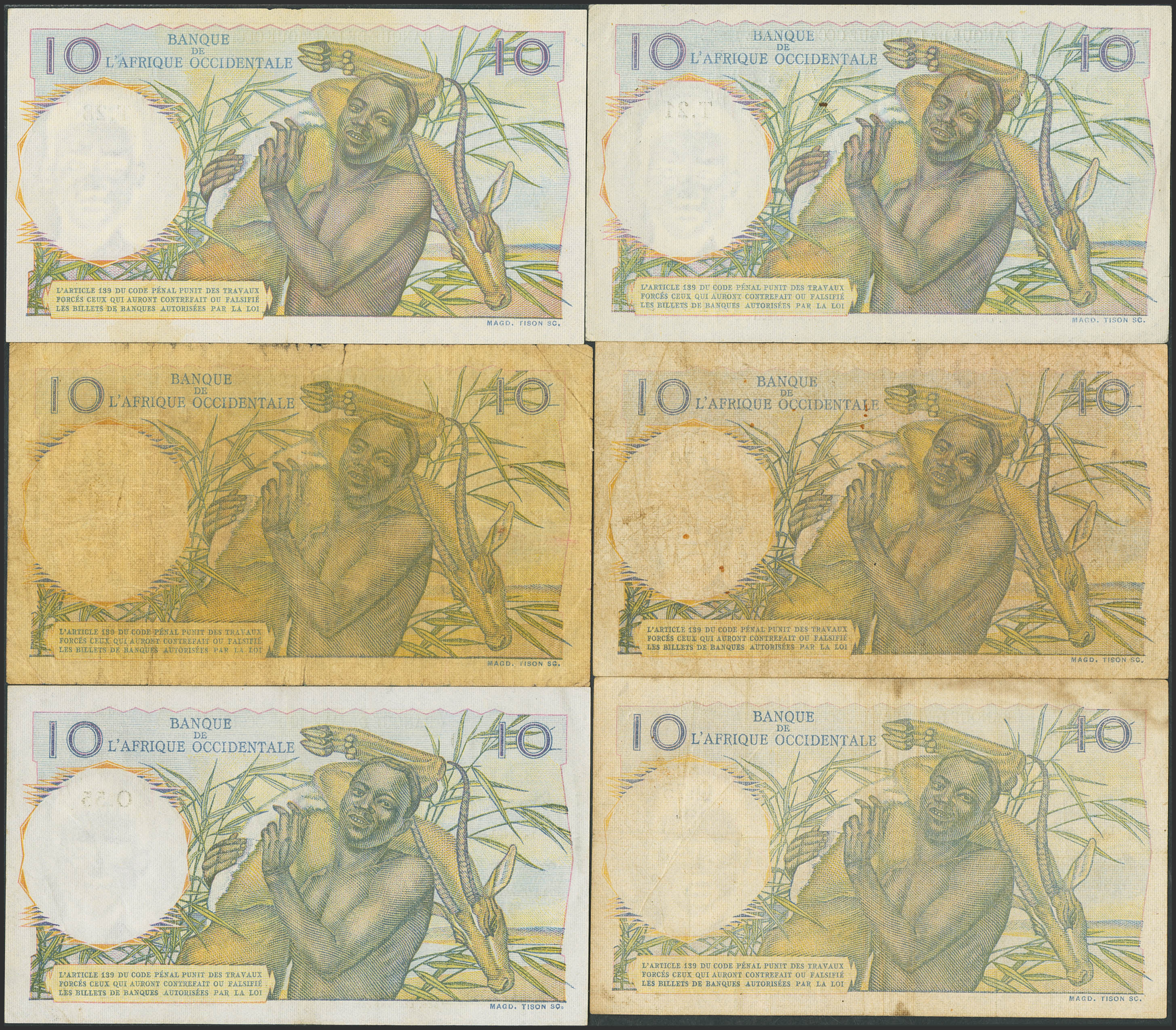 FRENCH WEST AFRICA. Lot of 6 notes of 10 Francs. 1947 to 1949. Banque de l'Afrique Occidentale. (Pick: 37). Fine (2), Very Fine (1), Extremely Fine (1), More than Extremely Fine (1) and Almost Uncirculated (1).