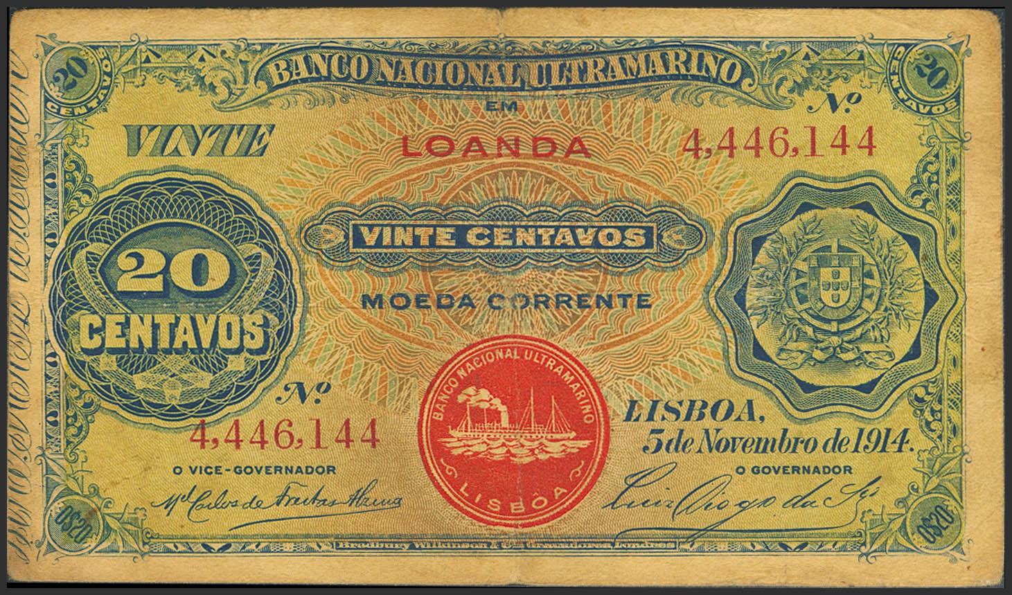 ANGOLA. 20 Centavos. 5 November 1914. Banco Nacional Ultramarino. (Pick: 42b). Very Fine.