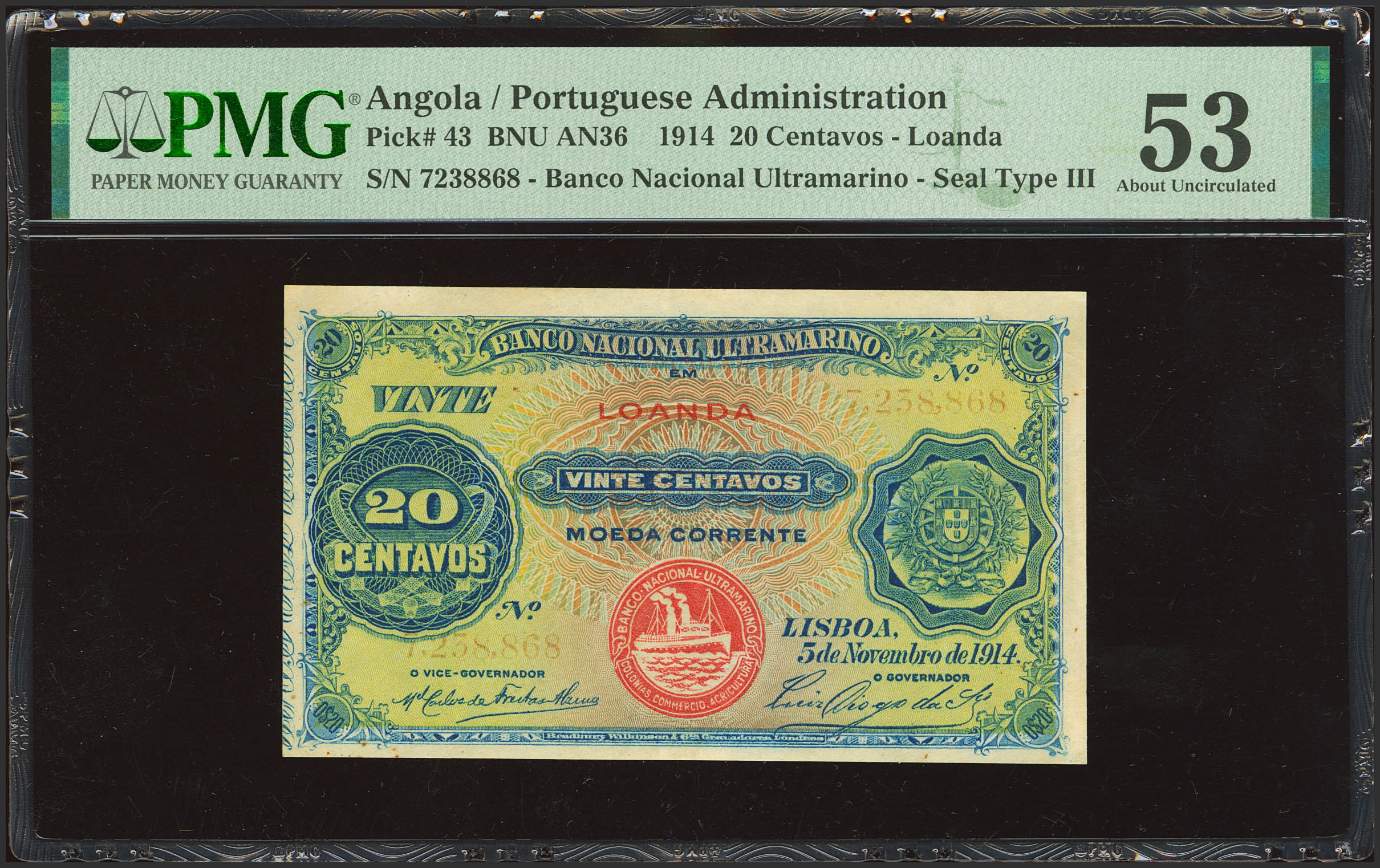 ANGOLA. 20 Centavos. 5 November 1914. Banco Nacional Ultramarino. (Pick: 43). PMG53 (serial number faded, minor rust).