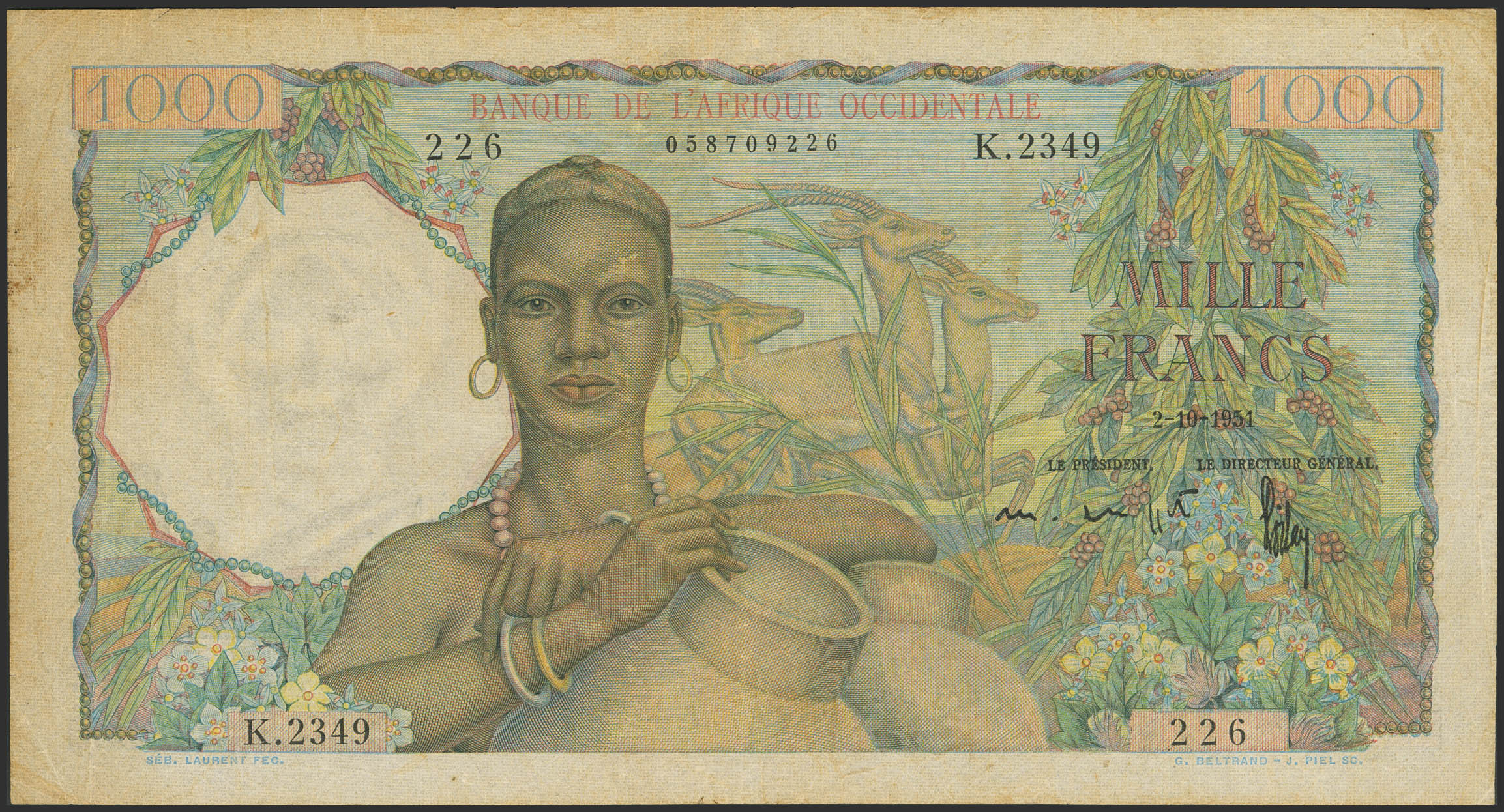 FRENCH WEST AFRICA. 1000 Francs. 2 October 1951. Banque de l'Afrique Occidentale. Signatures of Coppett and Poilay. (Pick: 42). Fine.