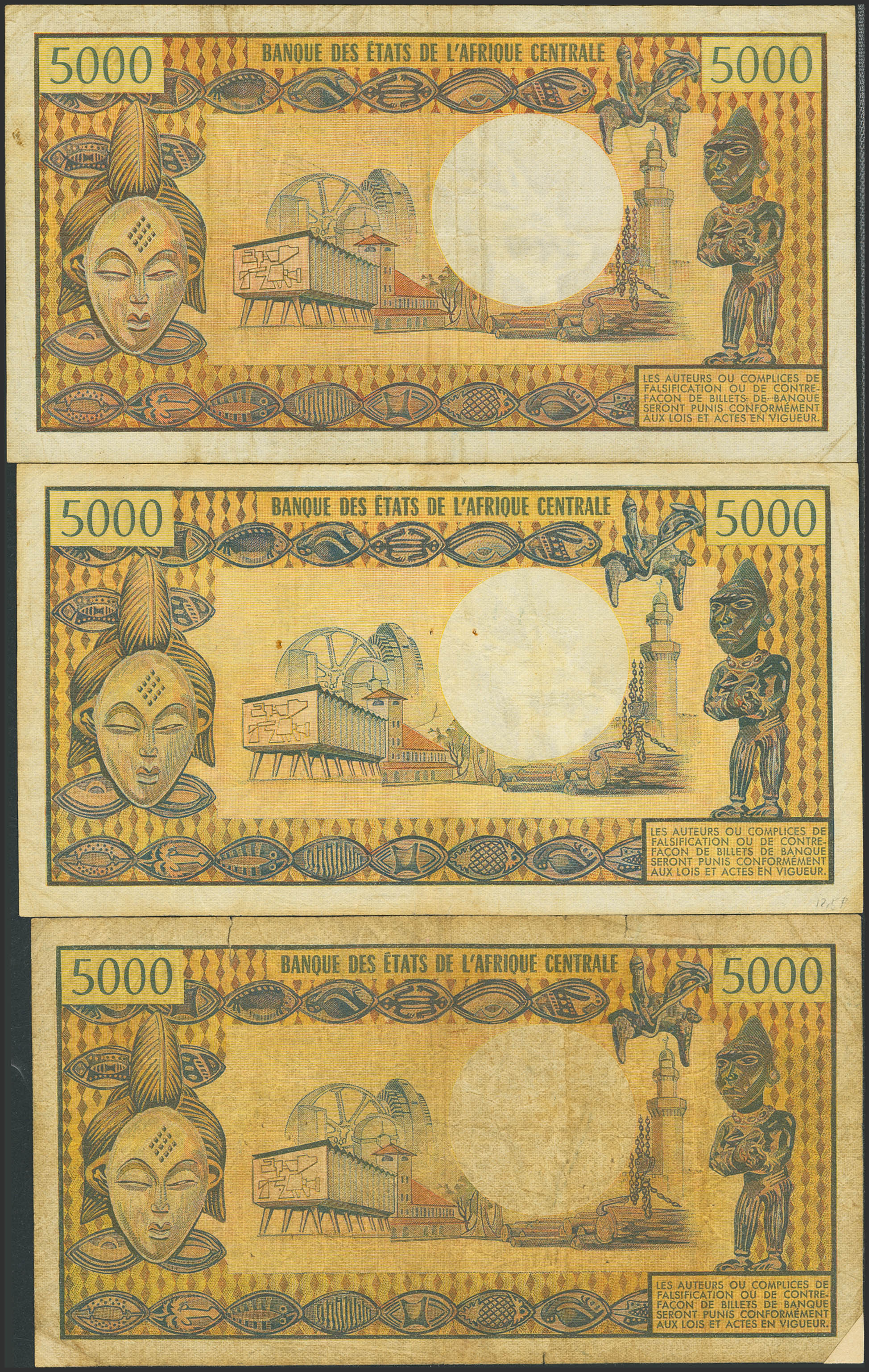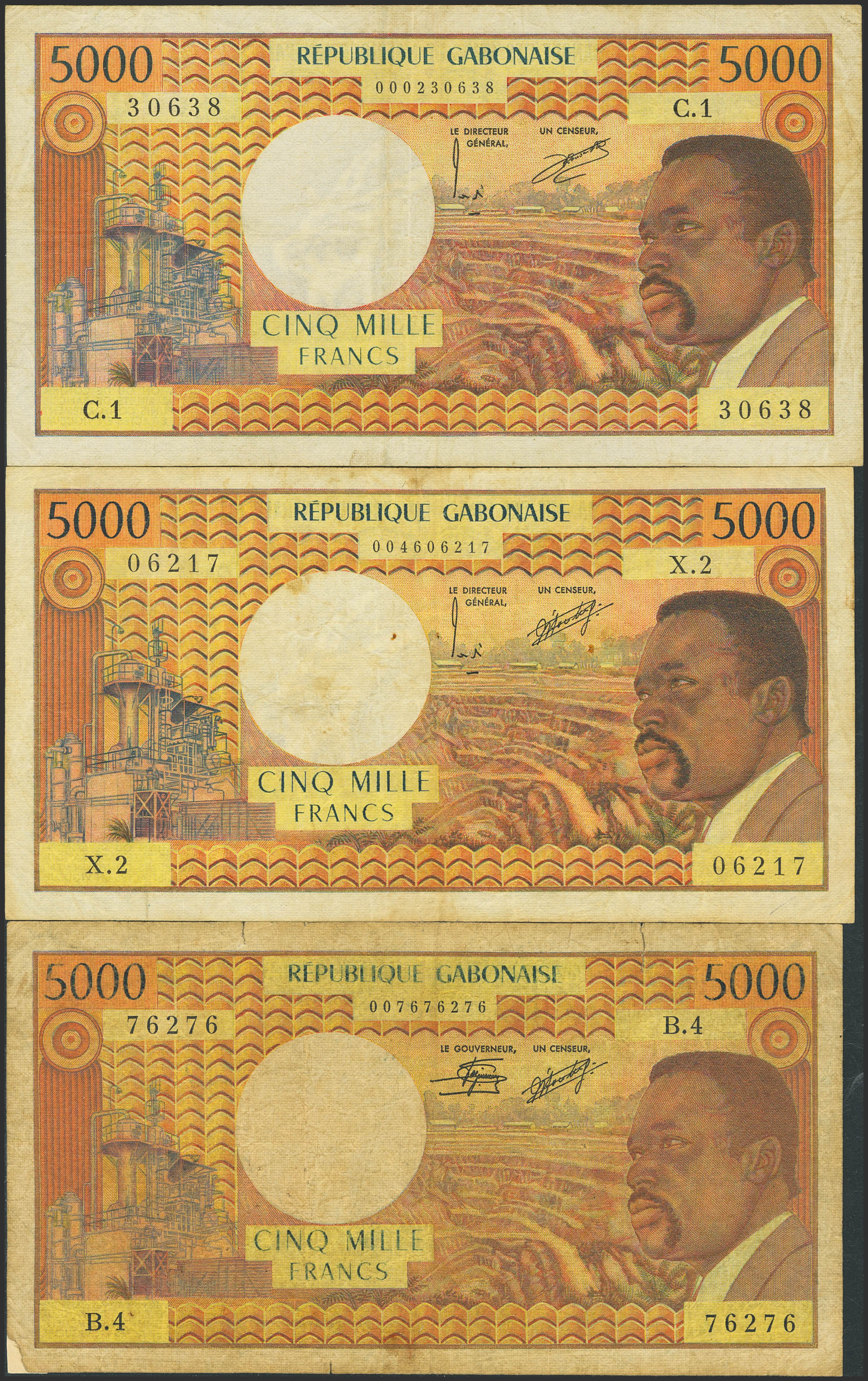 GABON. Lot of 3 notes of 5000 Francs. (1974ca). Banque des Etats de l'Afrique Centrale. (Pick: 4a, 4b, 4c). Adhesive paper added over missing corner on one of them. Fine and Very Fine (2).