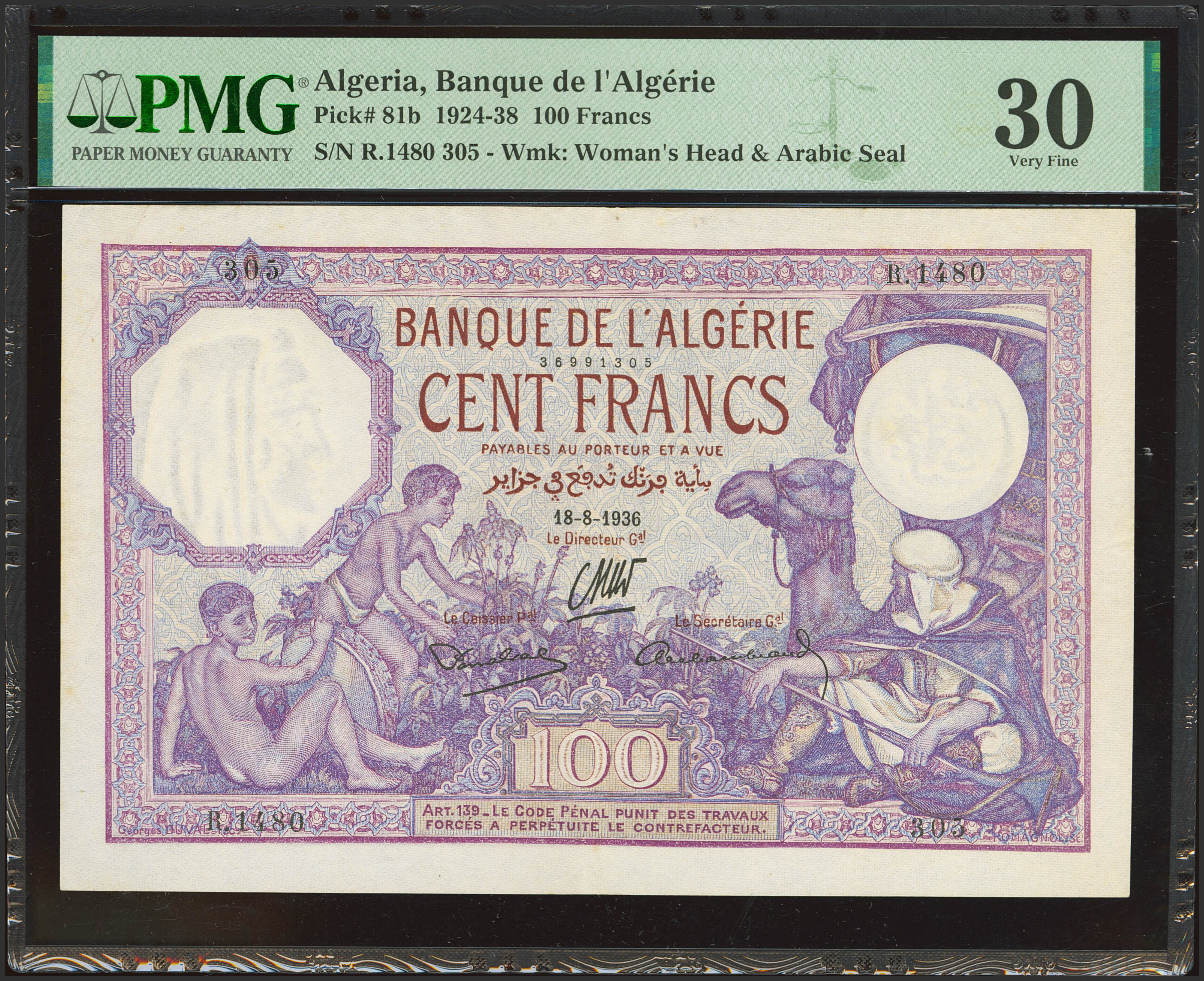 ALGERIA. 100 Francs. 18 August 1936. Banque de l'Algerie. Signatures of Escallier, Penalva and Archambaud. (Pick: 81b). PMG30