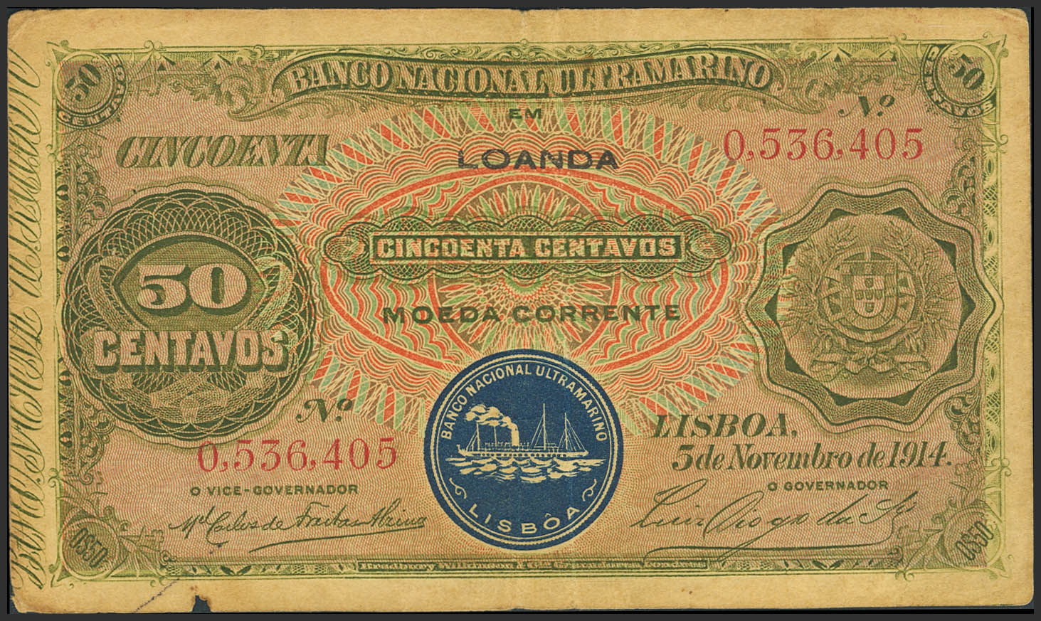 ANGOLA. 50 Centavos. 5 November 1914. Banco Nacional Ultramarino. (Pick: 45a). Very Fine.