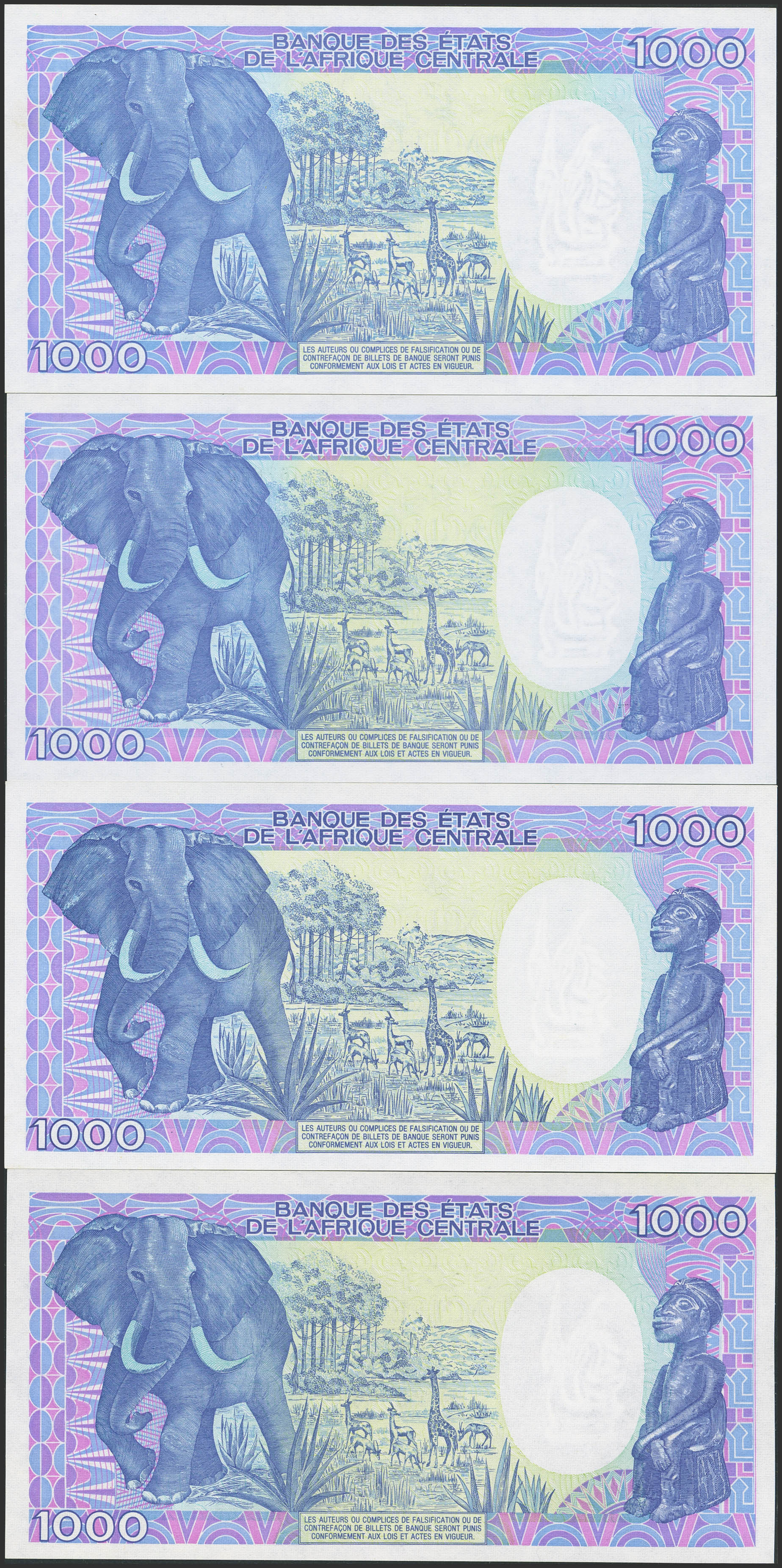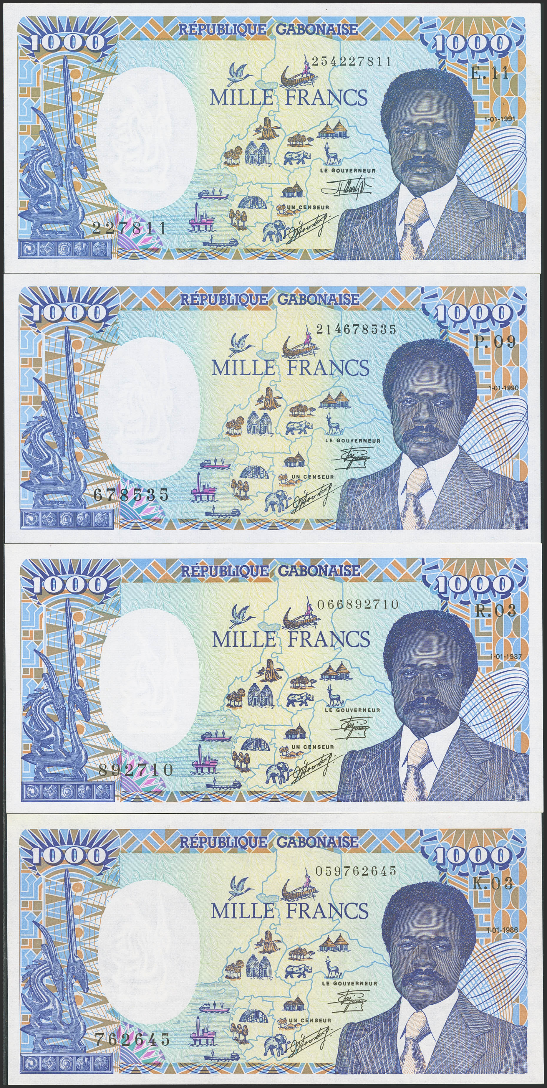 GABON. Lot of 4 notes of 1000 Francs. January 1 from 1986 to 1991. Banque des Etats de l'Afrique Centrale. Republique Gabonaise. (Pick: 10a(3), 10b(1)). Almost Uncirculated (1) and Uncirculated (3).