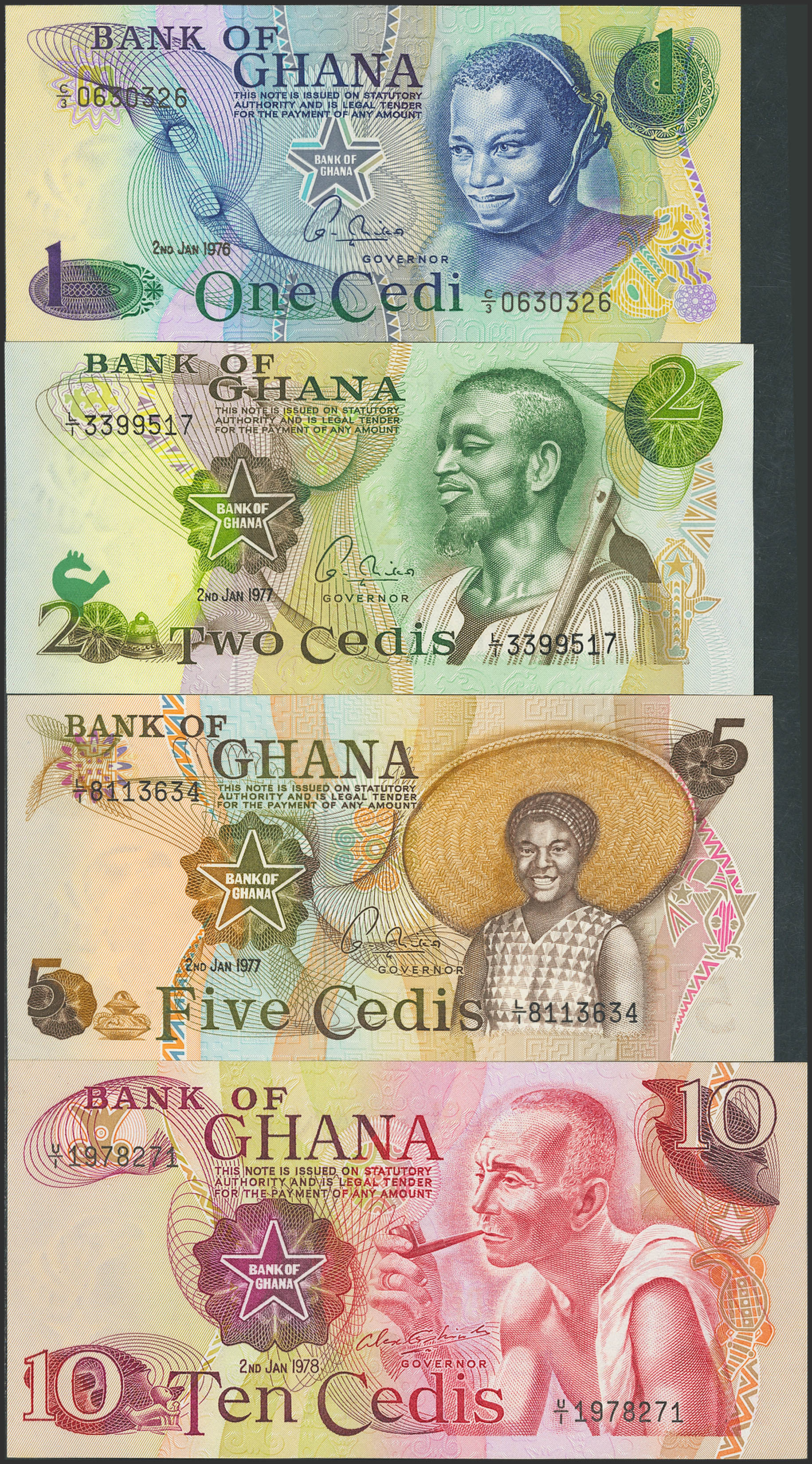 GHANA. Complete set of 4 notes from 1 to 10 Cedis. 1976 to 1978. Bank of Ghana. (Pick: 13c, 14c, 15b, 16f). Uncirculated.