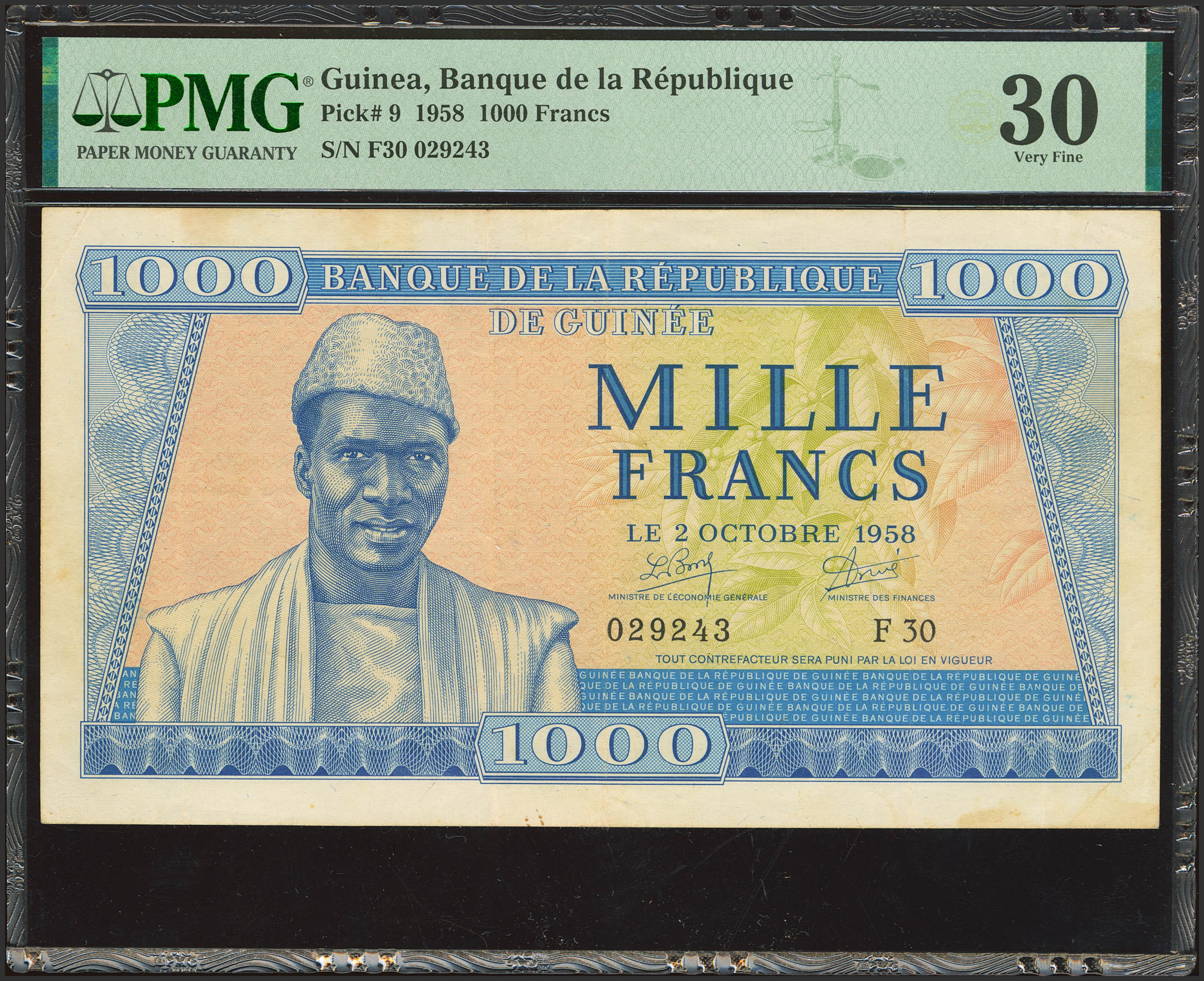 GUINEA. 1000 Francs. 2 October 1958. Banque de la Republique. (Pick: 9). PMG30 (minor rust).