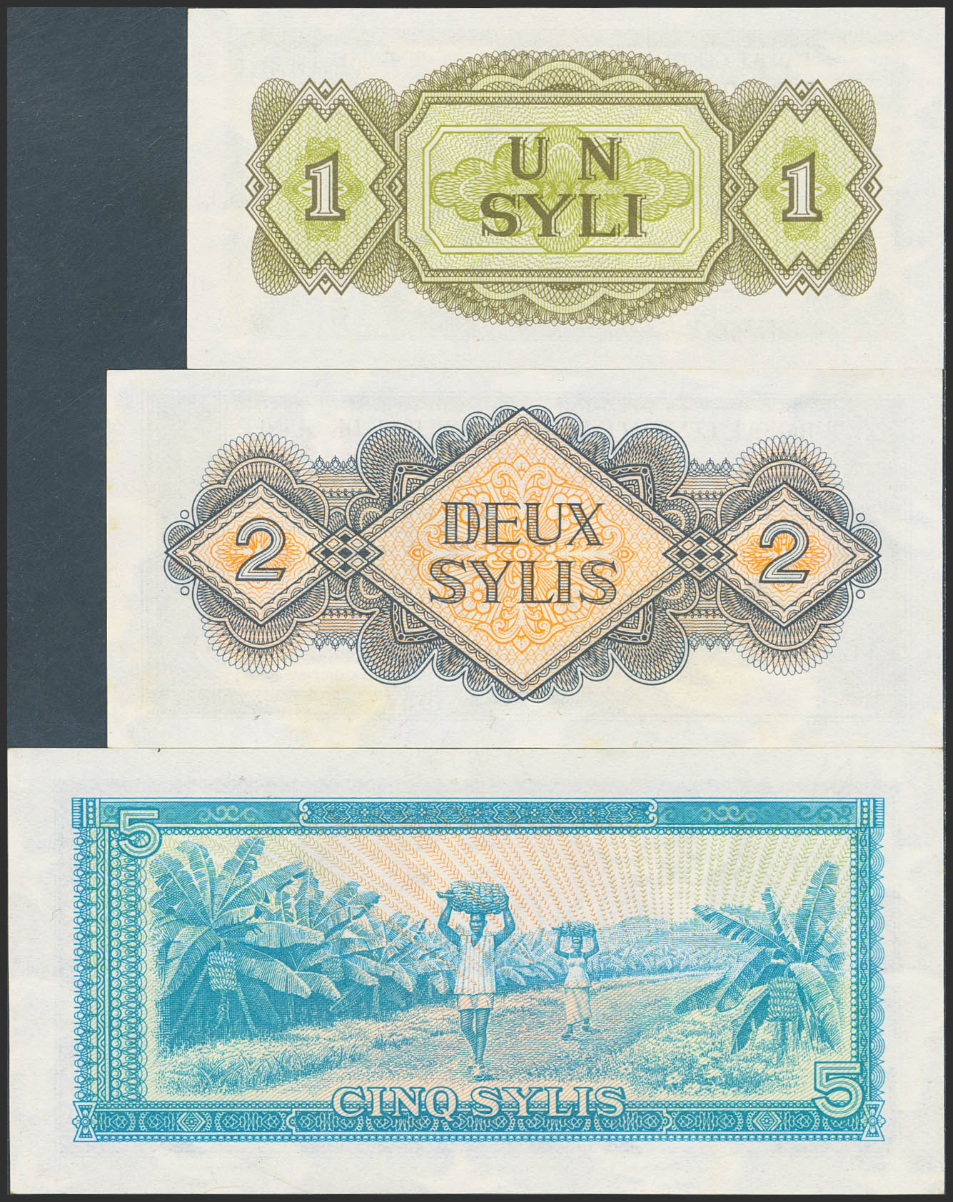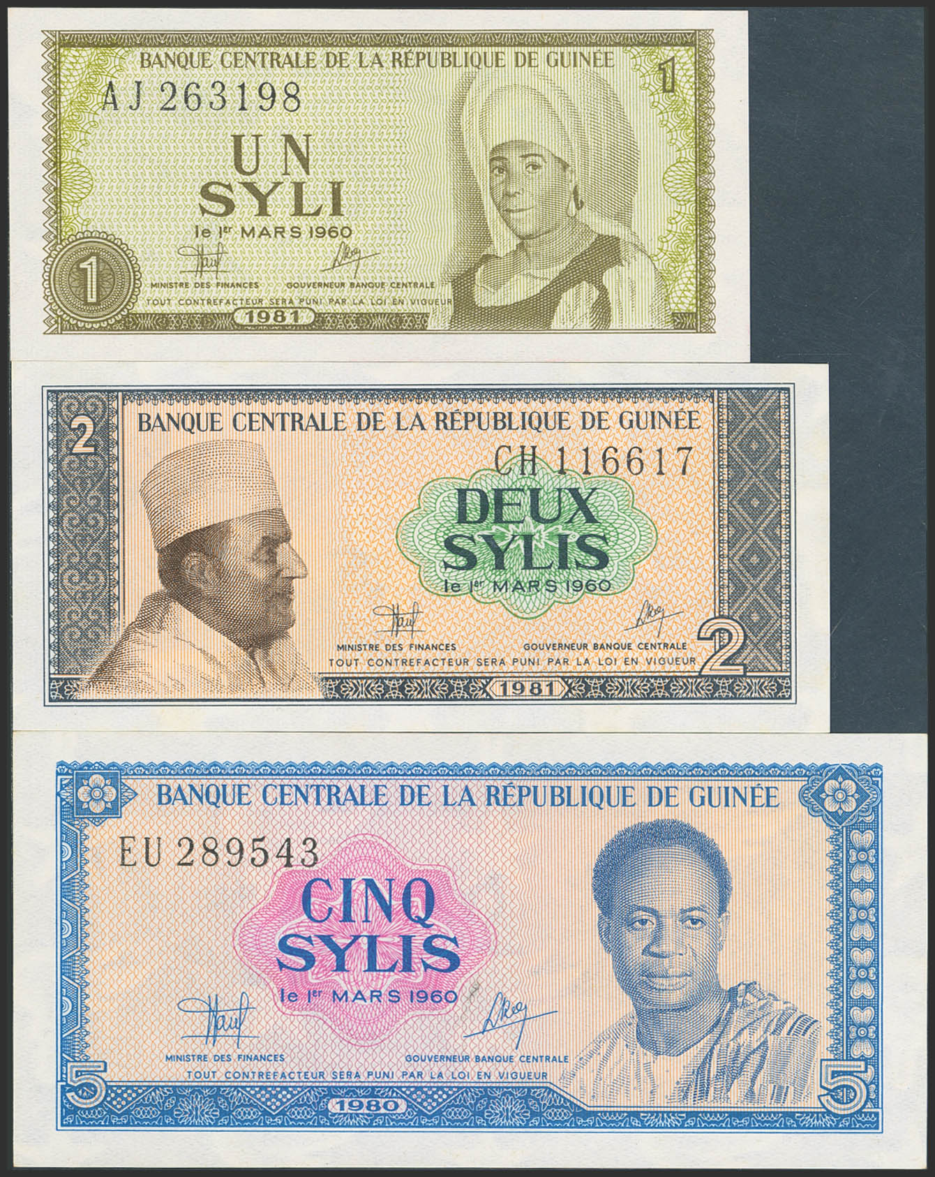 GUINEA. Lot of 3 notes from 1 to 5 Sylis. 1980 and 1981. Banque Centrale. (Pick: 20a, 21, 22). Uncirculated.