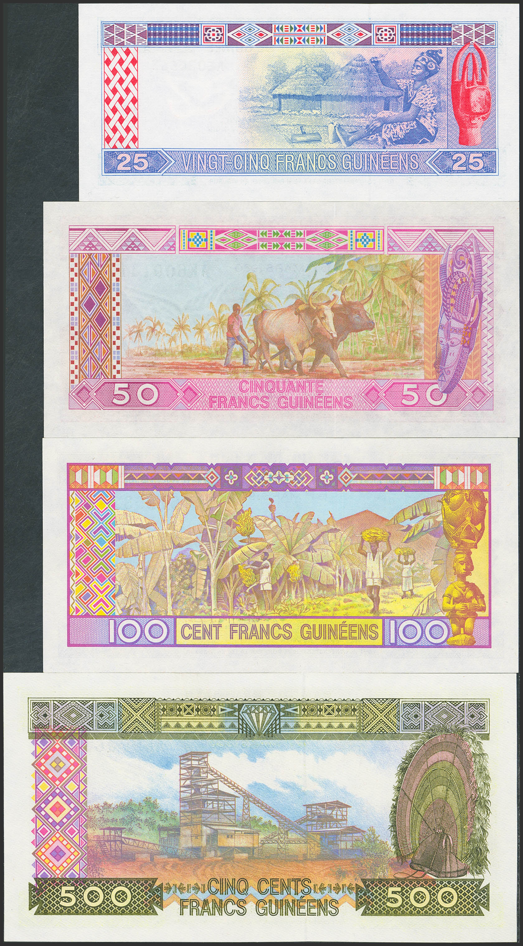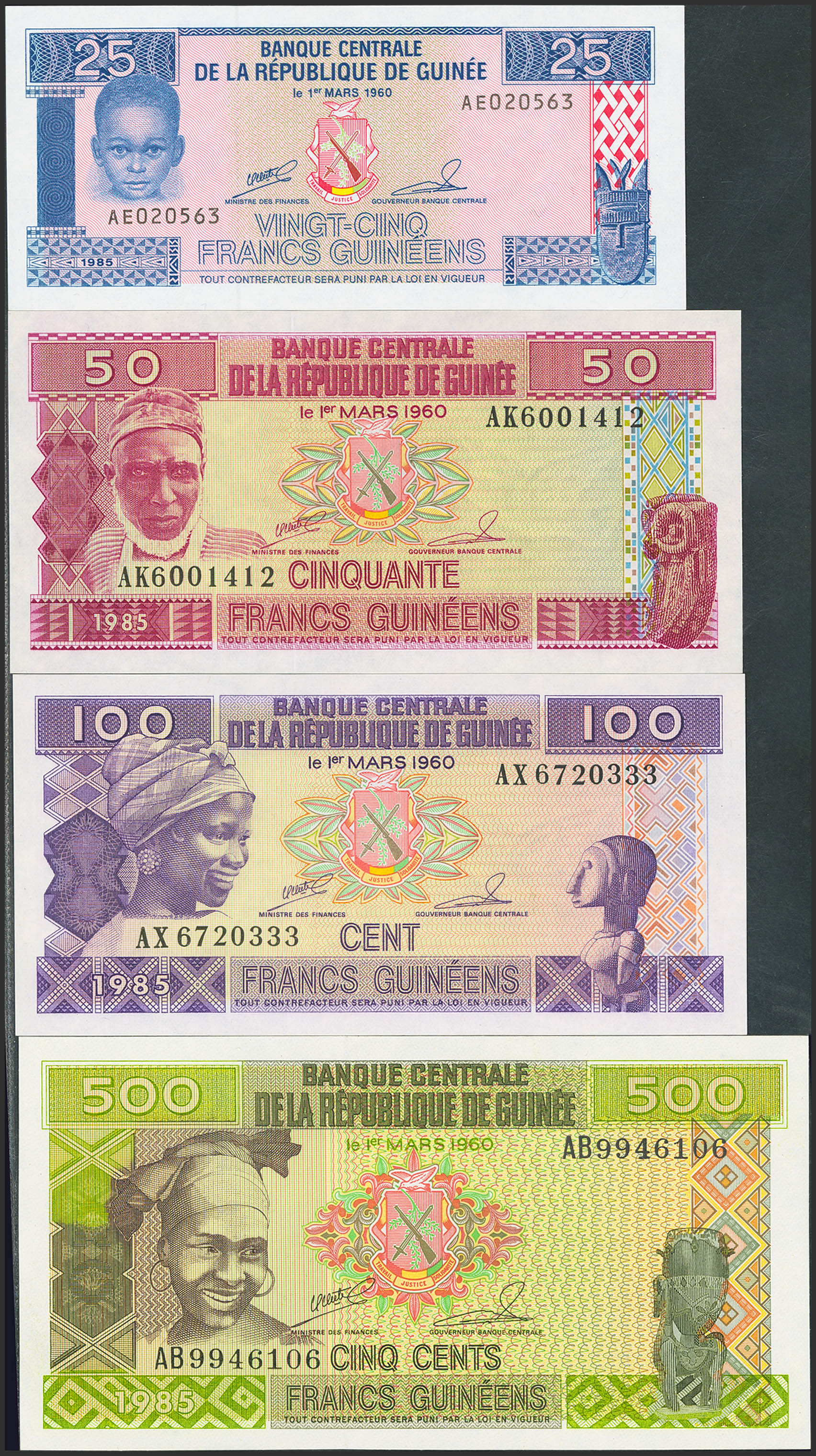 GUINEA. Lot of 4 notes from 25 to 500 Francs. 1985. Banque Centrale. (Pick: 28a, 29a, 30a, 31a). Uncirculated.