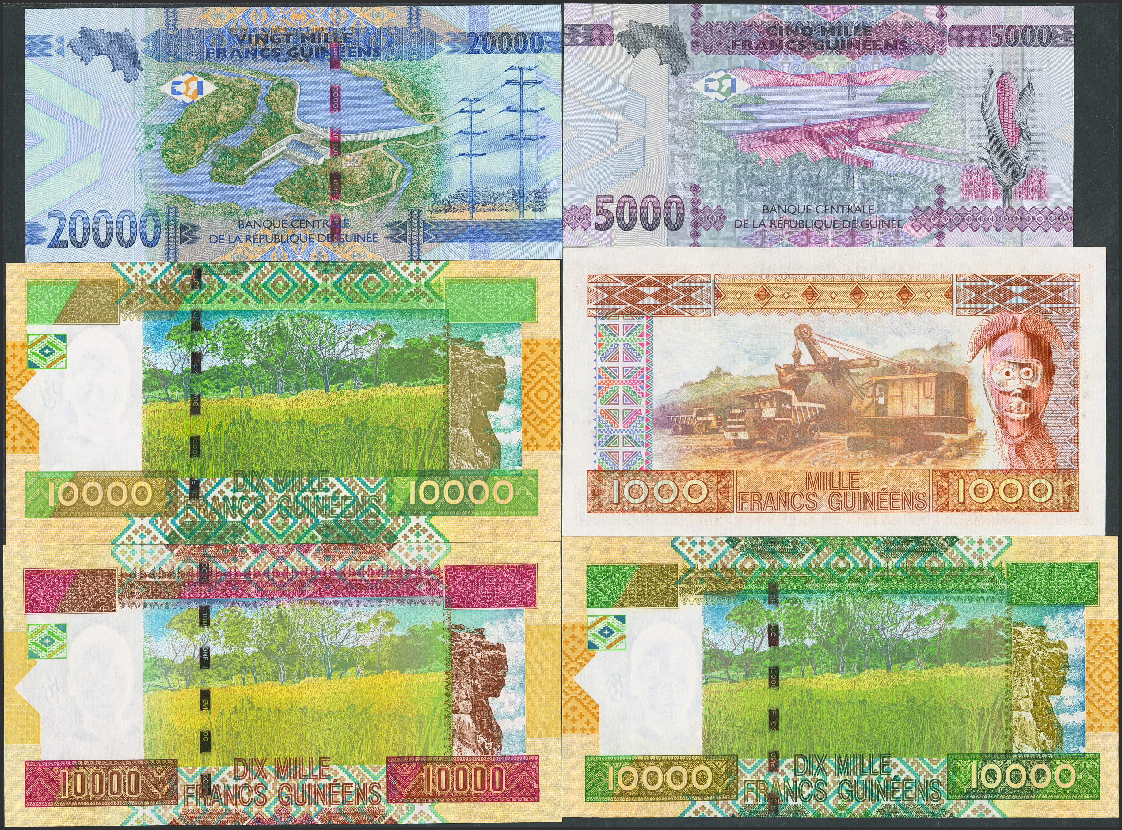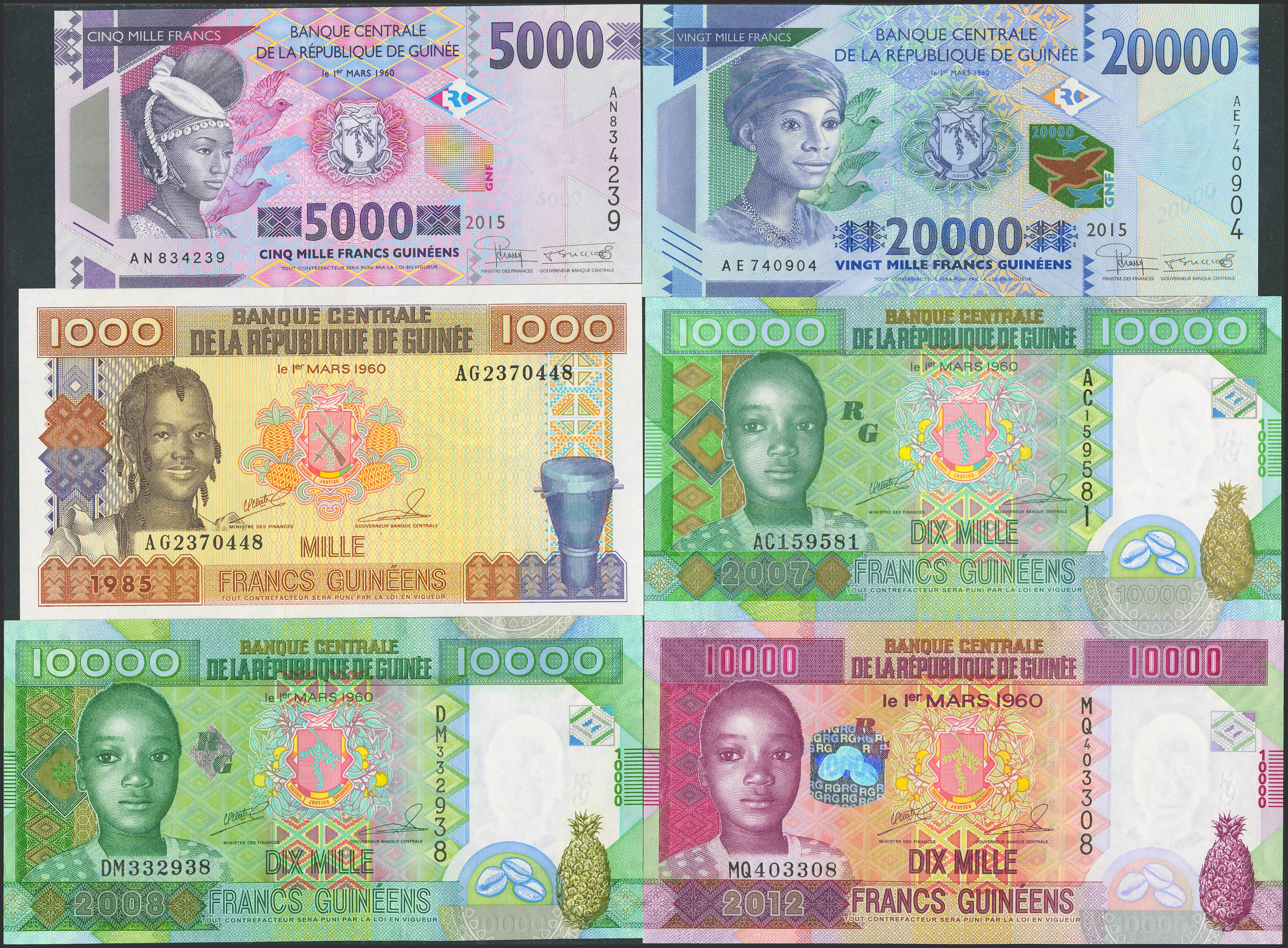 GUINEA. Lot of 6 notes from 1000 to 20000 Francs. 1985 to 2015. Banque Centrale. (Pick: 32a, 42a, 42b, 46, 49, 50). Uncirculated.